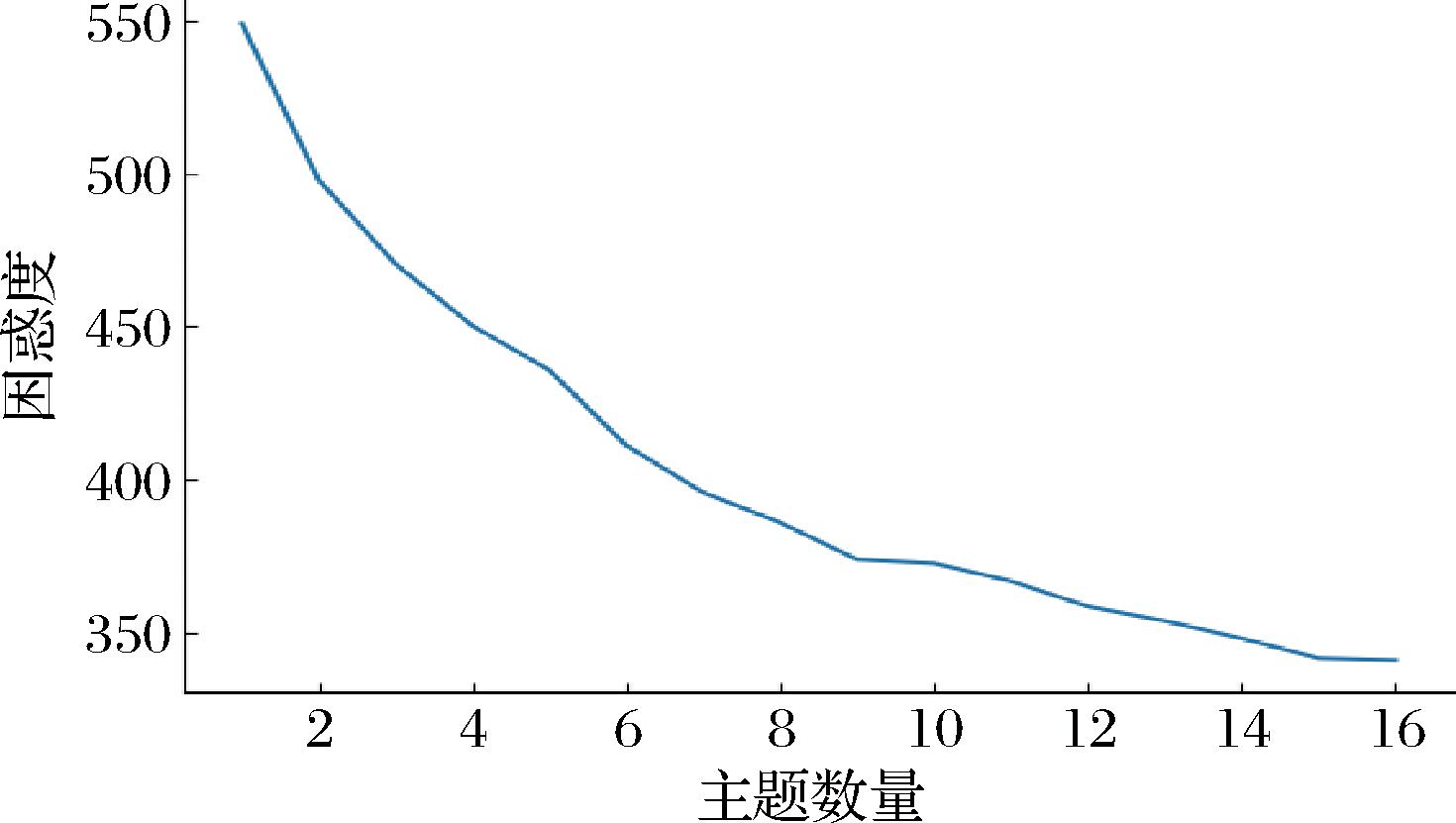 在进行LDA模型输出主题时,需要设置最优主题数。选择最优主题数可以帮助提高LDA模型的解释性,使得生成得主题更具代表性,容易被理解和解释。本文基于LDA主题模型的困惑度(perplexity)和一致性(coherence)指标分析结果,确定最优主题数为4个。如图3所示,从困惑度曲线来看,当主题数量从2增加到4时,困惑度值从420显著下降到360左右,表明模型拟合效果得到明显改善。然而当主题数超过4后,困惑度下降幅度明显趋缓,在主题数4到16的区间内仅下降不到20个点,此时,继续增加主题数量所获得的收益小于增加主题数量的投入[14],这种边际效益递减的现象表明继续增加主题数对提升模型性能的作用有限,反而可能导致模型过度拟合训练数据。仅依据困惑度选取的主题数目往往过大,而过多的主题可能导致模型过拟合,致使抽取的主题之间有较高的相似度[15-16],因此本文结合使用一致性指标。