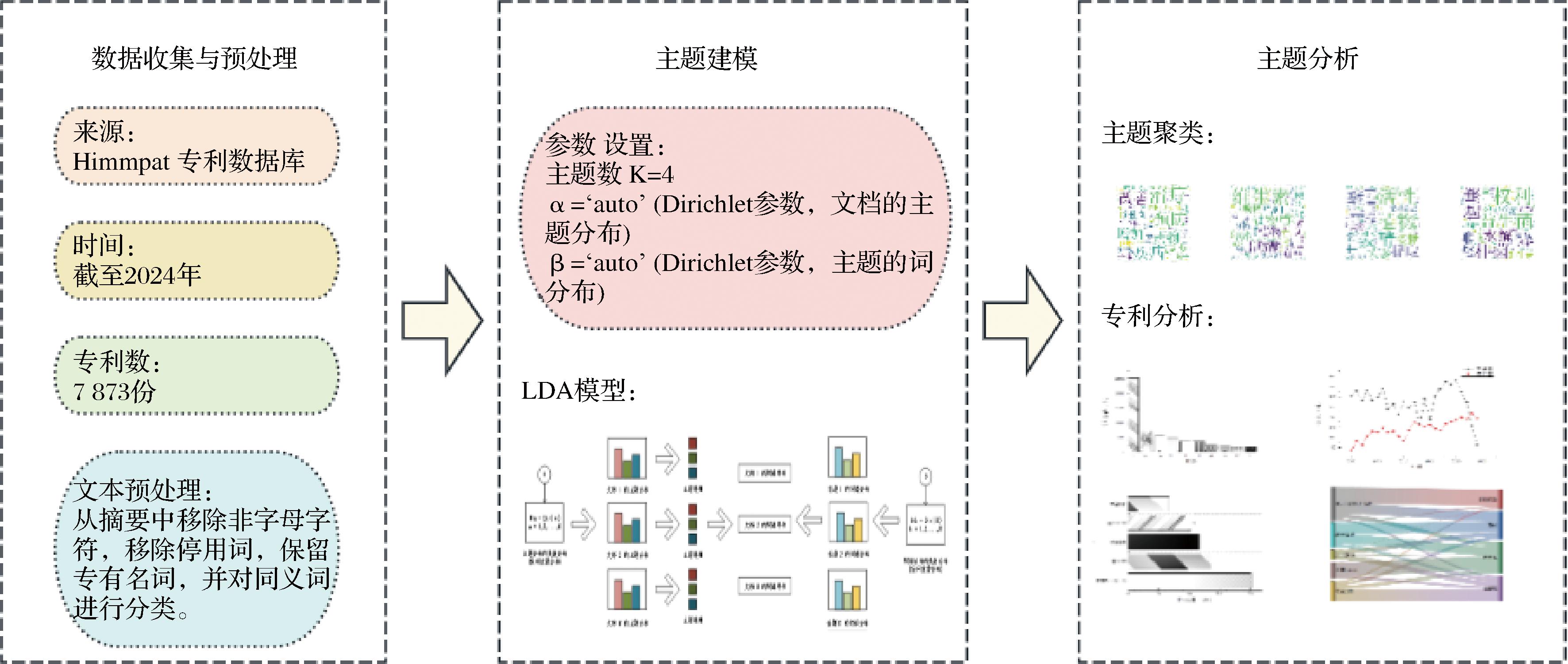 膳食不合理导致的人体营养与健康效应问题越来越突出,膳食结构调整对人体健康具有重要意义[1]。膳食补充剂作为维护和促进人体健康的重要手段,其市场需求与日俱增,推动膳食补充剂行业发展有助于优化整个食品产业结构,促进消费升级。而膳食补充剂行业在食品工业中正面临着技术创新的迫切需求,当前国内外学者对膳食补充剂的研究主要集中在其功效、安全性和市场监管等方面,例如新型膳食补充剂可以辅助高尿酸血症患者降低尿酸水平[2],小剂量补充维生素D能够更有效地降低癌症的总发病率和死亡率[3],孕期补充维生素D有助于预防儿童期高血压及相关心血管疾病风险[4-5],维生素K通过其非经典代谢途径保护细胞免受氧化损伤[6]。为了更好地理解膳食补充剂领域的技术演进和市场动态,本文采用潜在狄利克雷分布模型(latent Dirichlet allocation,LDA)对搜集到的专利文献的摘要进行主题建模。LDA模型作为一种文本挖掘技术,能够有效地从大量文本数据中提取主题信息,这对于理解膳食补充剂领域的技术演进和市场动态具有重要意义[6]。通过分析全球膳食补充剂专利的分布情况、专利申请与授权趋势、主要申请人情况以及专利技术布局,为我国膳食补充剂行业的创新发展提供科学依据,并为消费者选择高质量膳食补充剂提供参考。本文研究框架如图1所示。