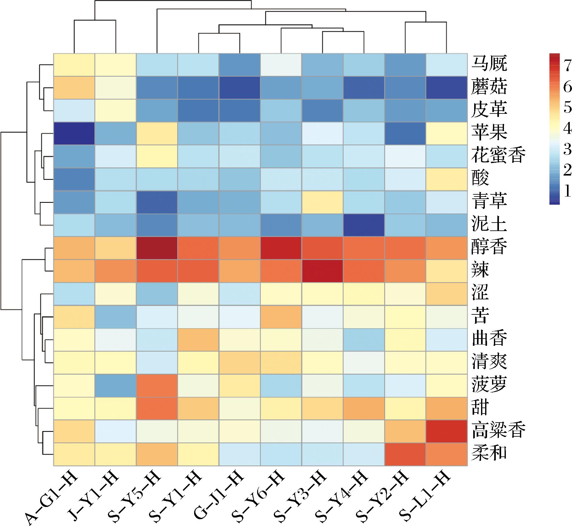 从样品聚类结果来看,大部分宜宾产区的样品集中在中部,说明宜宾产区的大部分样品具有较明显的感官特征,且江淮产区的J-Y1-H、A-G1-H与宜宾产区样品感官特征存在较明显的差异,其中差异较大的感官特征为“蘑菇”及“马厩”。泸州产区的S-L1-H样品与宜宾S-Y2-H样品位于聚类图的最右侧,其“高粱香”突出;相比于江淮产区的2个样品,泸州产区的S-L1-H及甘肃的G-J1-H样品其整体感官特征更接近宜宾样品。这一结果表明,成品酒在一定程度上可以反映产区感官特征的独特性,但是通过贮存及勾调等过程,成品酒的感官特征并不能完全代表其产区的特征。因此在未来将通过采集不同产区浓香型白酒的基酒来探究不同产区浓香型白酒感官属性的独特性,并明确产区独特性可能与各产区的酿造原料、工艺以及环境条件等因素有关的相关性,从而进一步探究产区对白酒感官品质的重要影响。