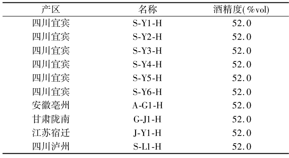 本实验以5个代表产区的10种浓香型成品酒样品为研究对象。样品在仪器分析前贮存于4 ℃冰箱中,具体信息如表1所示。