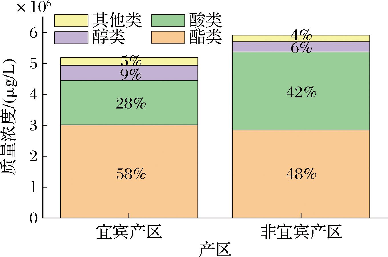 酸类物质主要是在乙醇代谢过程中产生的[17],白酒中的酸类化合物绝大部分为有机酸[18],可通过提供酯类前体物质、促进酒体老熟等方式直接或间接影响酒体中呈香呈味程度和各类物质之间的融合度[19],对白酒的香气、味道具有巨大影响[20]。己酸、丁酸、乳酸、乙酸是浓香白酒的重要酸类物质,具有明显的定味作用。乙酸可以产生强烈的刺激性酸味;适量的丁酸能增加酒体“窖香”,但过浓有“汗臭”气味。浓香型白酒中己酸也是产生“窖香”的主要成分之一[20]。宜宾产区酸类化合物的质量浓度之和占所有定量化合物质量浓度的28%,非宜宾产区该类化合物的质量浓度和占所有定量化合物质量浓度的42%,表明该类化合物在不同产区之间存在较大差距。