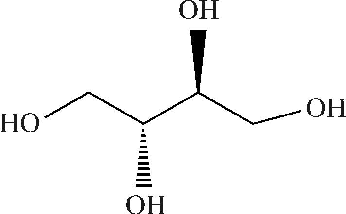 赤藓糖醇作为四碳线性多元醇类甜味剂(图1),具有低热量与高耐受性特性,天然存在于葡萄、蘑菇及酱油等发酵食品中[1-2]。其甜度达蔗糖的70%~90%,常与甜菊糖苷复配以中和异味,高溶解热特性还可赋予食品清凉口感[3-4]。赤藓糖醇作为一种糖替代品,约90%摄入量经肾脏快速排出,不参与能量代谢且不引起人体血糖变化,但单次超过35 g(安全剂量0.6~0.8 g/kg)可能引发腹泻等不适[5-6]。此外,赤藓糖醇能抑制口腔致龋菌黏附,降低蛀牙风险[7]。