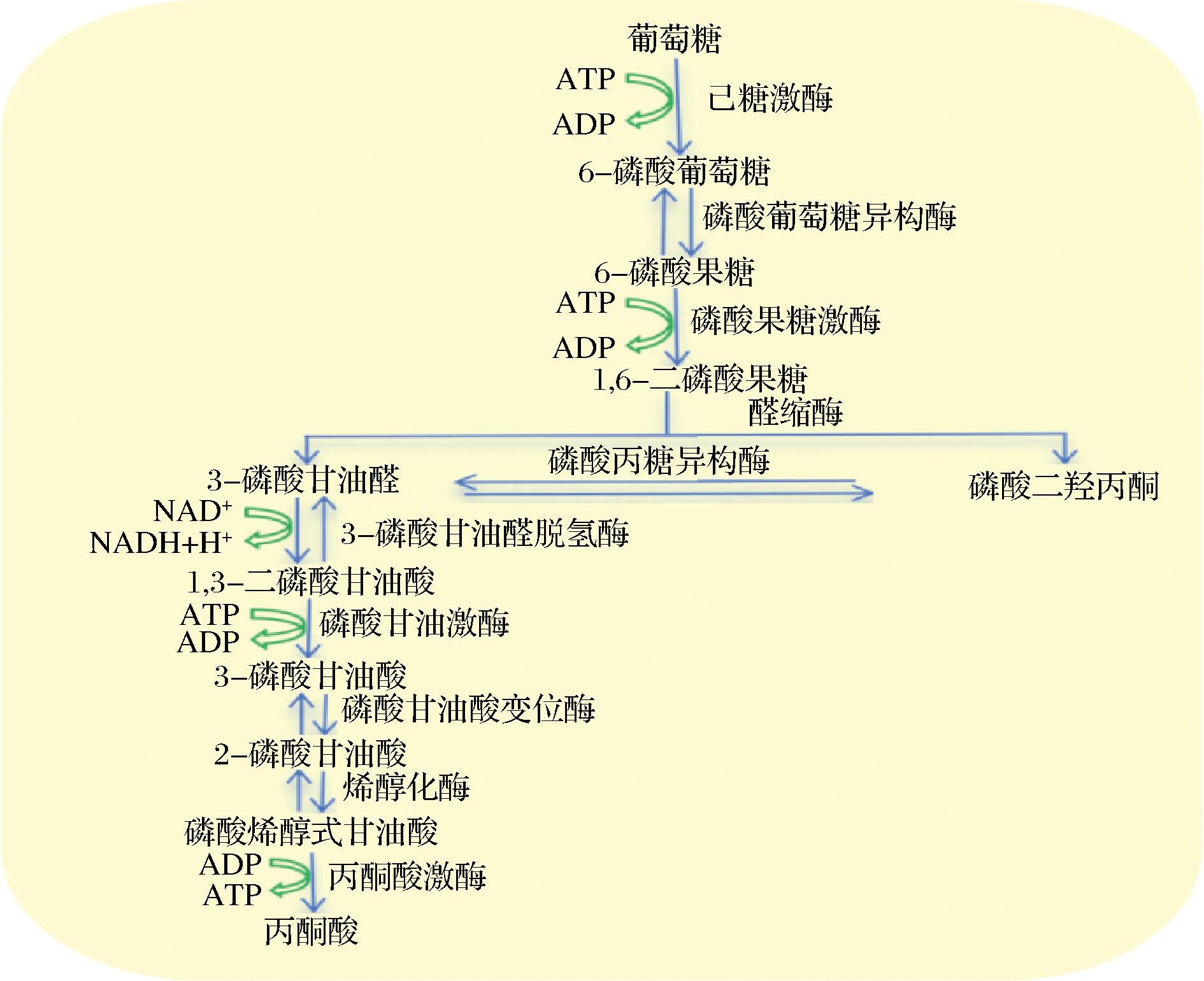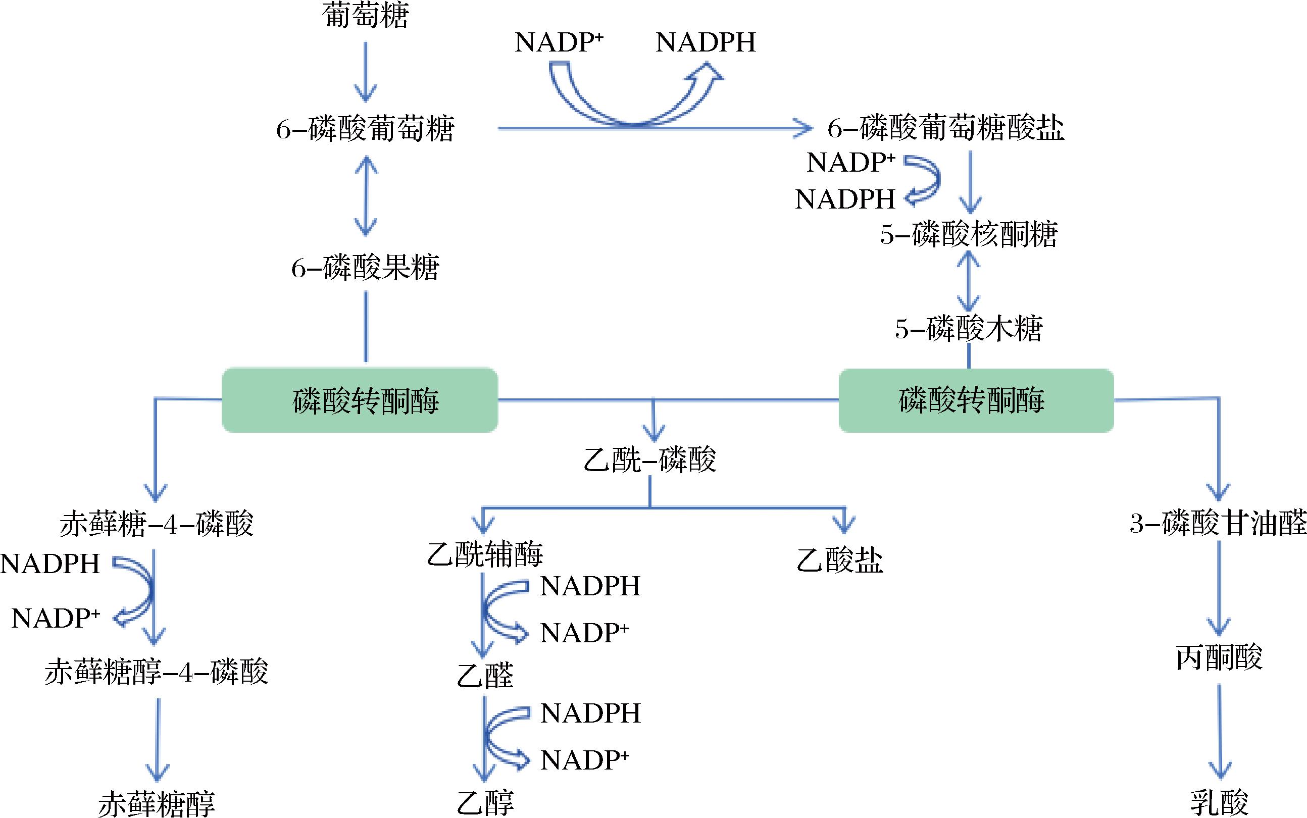 某些细菌菌株能够通过葡萄糖发酵产生赤藓糖醇,但产量较低,通常作为发酵过程的副产物生成[21]。乳酸菌在异型乳酸发酵过程中,通过磷酸转酮酶代谢糖类,生成乙酰磷酸和3-磷酸甘油醛等中间产物,最终转化为乳酸、乙醇或乙酸(图4)[22-23]。TYLER等[24]的研究表明,乳酸菌Lactobacillus florum无需在厌氧条件下可利用葡萄糖生产2.04 g/L赤藓糖醇。
