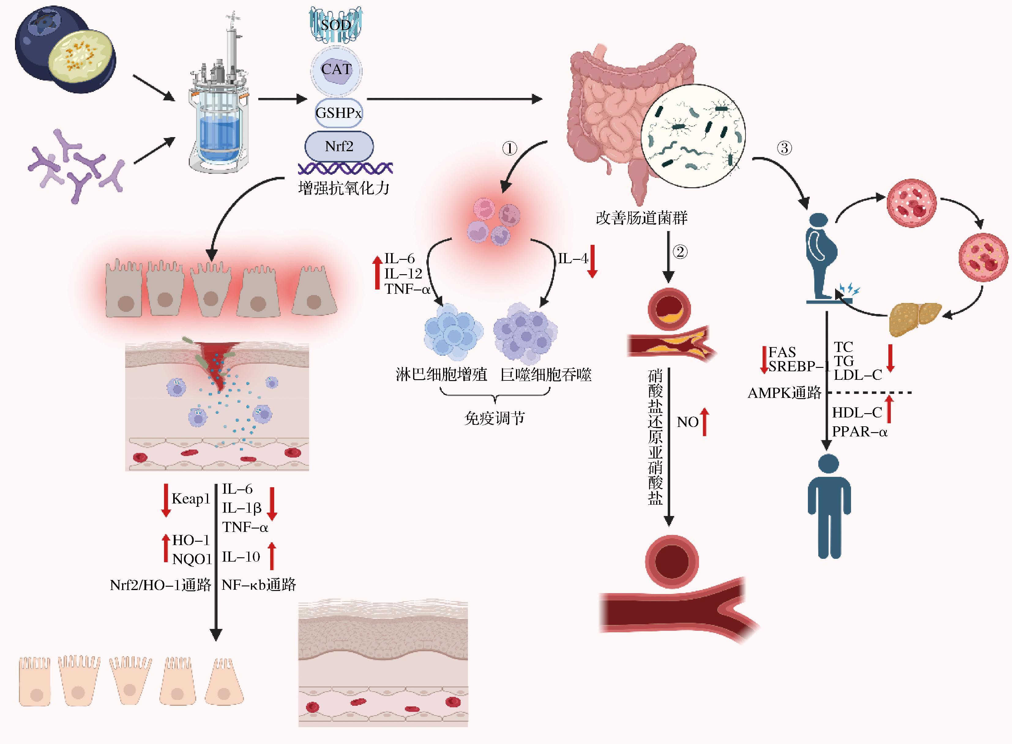 蓝莓鲜果富含花青素、多酚和原花青素等抗氧化成分。在发酵过程中,微生物会产生多种抗氧化代谢物,如短链脂肪酸(乙酸、丙酸和丁酸)、抗氧化酶(SOD和过氧化氢酶)等,这些物质可中和体内活性氧(reactive oxygen species,ROS)的产生,从而减少氧化应激[62],微生物发酵蓝莓后会增强其抗氧化力,从而直接改善炎症,亦或通过调节肠道菌群改善代谢、炎症及调节免疫(图2)。研究表明蓝莓通过微生物发酵可提高总酚含量和DPPH自由基、ABTS阳离子自由基和羟自由基清除率[6]。蓝莓发酵后酚类化合物含量增加,DPPH自由基、羟自由基和超氧阴离子自由基的清除率提升,且在H2O2诱导的Caco-2细胞氧化损伤模型中加入0.1 g/L发酵蓝莓汁可显著增加SOD和谷胱甘肽含量,从而提高抗氧化能力[9]。植物乳植杆菌CK10发酵蓝莓提取物中抗氧化活性发现,DPPH和ABTS阳离子自由基清除率、SOD活性增加,此外还通过检测发酵物(2 mg/mL)对H2O2诱导的HepG2细胞中ROS水平来评价细胞抗氧化活性,结果显示蓝莓发酵物降低了HepG2细胞的2′,7′-二氯荧光素荧光强度,细胞内ROS水平减少[17]。