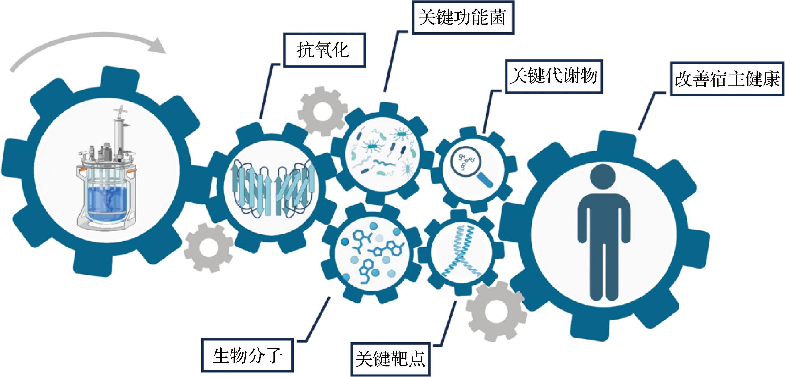 对微生物发酵蓝莓的功能作用进行初步的归纳总结发现,微生物发酵蓝莓后的抗氧化功能、肠道菌群调节和宿主健康三者之间的关系可能存在“齿轮效应”(图1)[61],微生物发酵后提升抗氧化作用,一方面可通过调节生物分子(核酸、蛋白质、脂质等构成生命活动的基本分子)影响关键靶点,达到直接改善宿主健康;另一方面可通过调节关键肠道菌群促进关键代谢物的产生从而间接发挥改善宿主健康的作用。