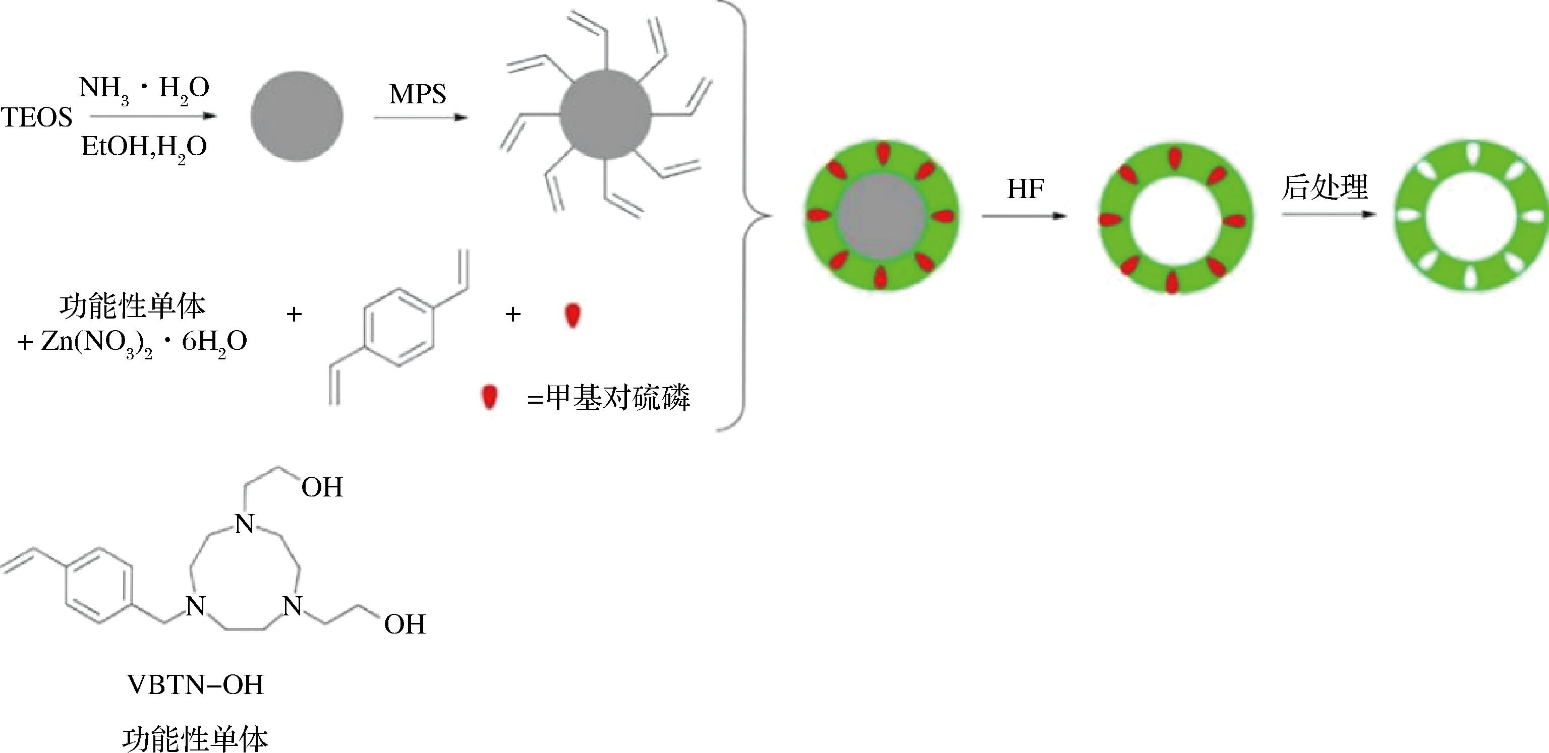 甲基对硫磷是一种广泛使用的有机磷农药,因其高效的杀虫效果而被广泛应用于农业生产中。然而,甲基对硫磷具有较高的毒性和难以降解的特性,对环境和食品安全构成了潜在威胁。对有机磷农药进行靶向降解是解决农药残留的一个重要的技术途径。MIC可以显著提高有机农药的降解效率。WANG等[51]以聚吡啶配体N-(4-乙烯基苄基)-双(2-吡啶基)胺为功能单体,制备了高效催化降解甲基对硫磷的MIPs催化剂。制备程序如图6所示,采用溶胶-凝胶法制备了纳米SiO2粒子,并引入了乙烯基,在乙醇溶剂中通过沉淀聚合制备具有模板分子的MIP@SiO2核壳微球,采用氟化氢(hydrogen fluoride,HF)修饰二氧化硅核,并经过一系列后处理去除模板分子,得到空心纳米胶囊催化剂。该研究中制备的催化剂表现出优异的催化水解性能,其初始反应速率是自然环境下的415倍,米氏常数低至0.87 mmol/L。这表明该催化剂在降解有机磷农药方面具有显著的效率优势。