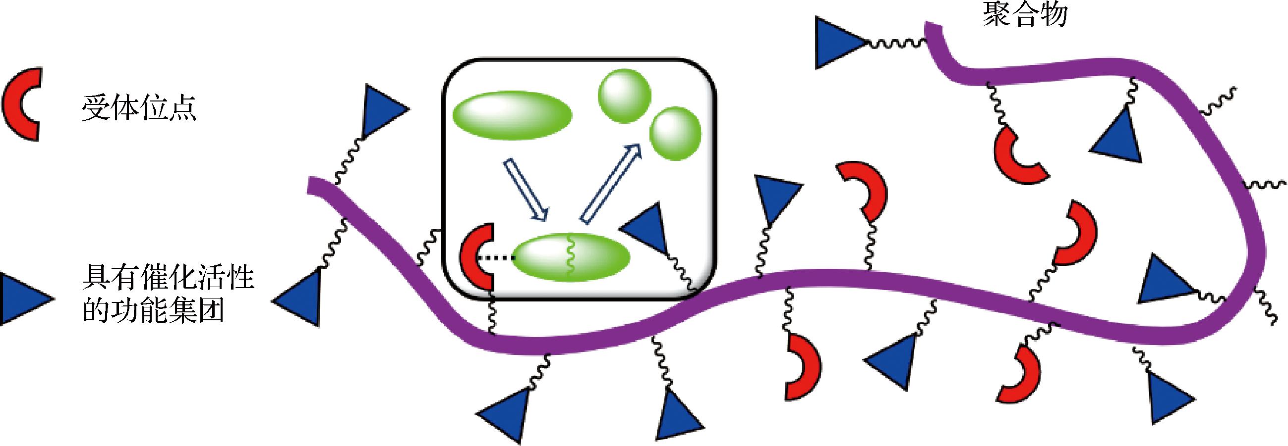 受酶自然进化的启发,MENGER等[17]率先探索了以“适者生存”方式进化催化剂的方法,成功地建立了基于高通量筛选的组合方法,用于挖掘随机产生的具有理想性能的MIPs。目前,组合聚合物已发展成为一种优良的催化剂支架,聚合物的自动组合衍生将产生大量随机功能化的聚合物库。以MENGER等[17]提出的模块化组合方法为基础,MOTHERWELL等[18]以聚合物骨架为特征主链,随机连接受体位点和催化活性的基团,构建“千足虫”催化剂。如图3所示,任何给定的受体位点都可能被多个近端的催化基团包围,这些催化基团通过改变电子轨迹来催化结合的底物。该研究提出的模块化组装方法,将受体位点和催化活性基团连接到一个聚合物主链上,用于构建催化剂。该方法不仅在技术上提供了一种新的催化剂构建的方法,而且实现了理性设计和人工选择相结合,相关研究为催化剂的发展提供了新的思路。