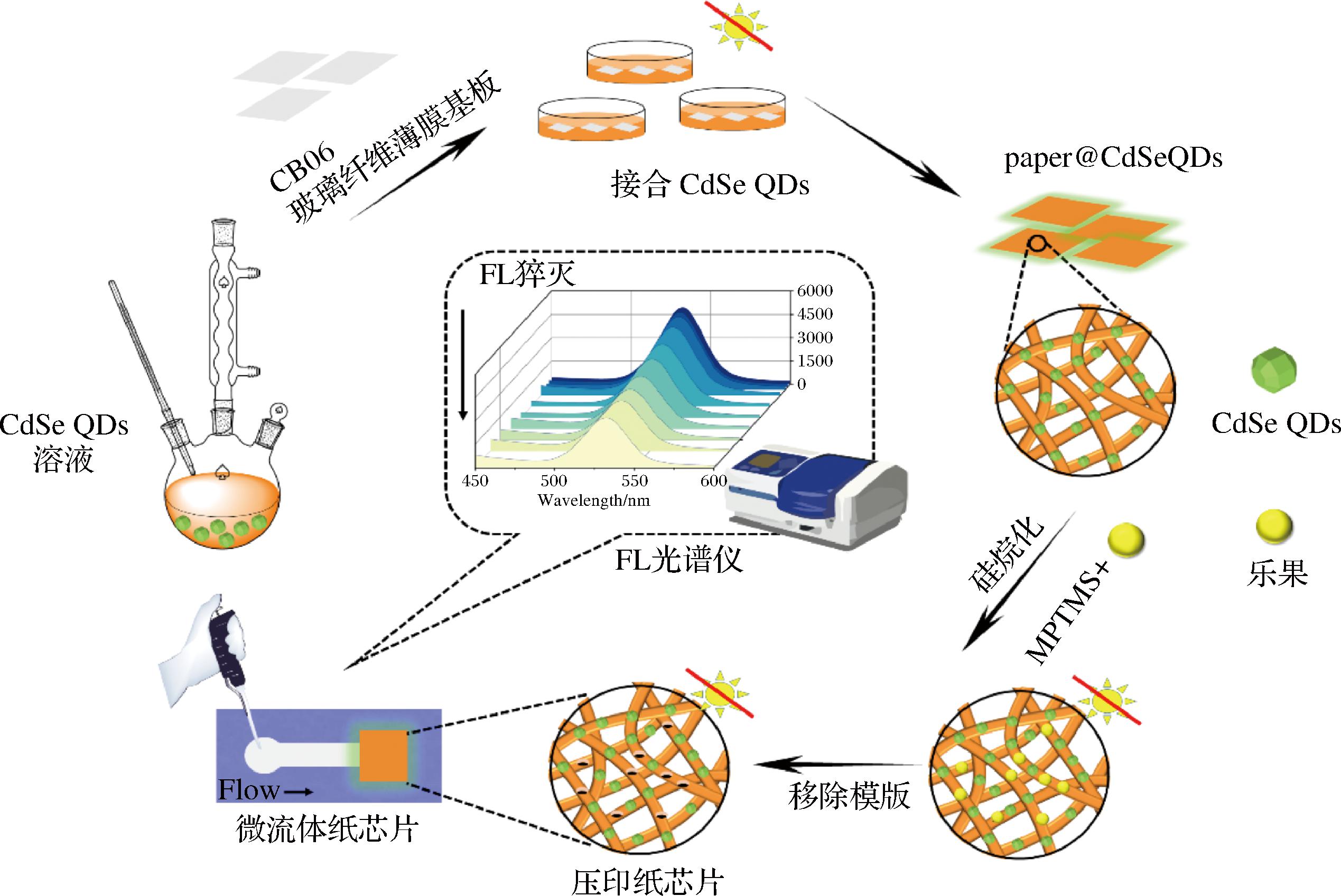纸基板是整个微流控芯片的核心部件,纸的类型对分析检测有重要影响,普通纸张重复利用率低且存在与荧光材料结合后背景荧光高等问题。玻璃纤维纸具有较好的机械耐久性,在水相中无明显变形和崩解,能够形成清晰的检测区域,还可以避免过度分散,减少传统方法中容易产生的干扰效应等。YAN等[76]以绿色方式合成了油溶性CdSe QDs作为荧光材料,在静态猝灭和光致电子转移机理的基础上选择性检测大豆中的杀虫剂乐果(图7),检测限为80.0 μmol/L,回收率为97.6%~104.1%。本研究将玻璃纤维纸和MIPs-荧光复合材料融合在一起,所用的玻璃纤维纸因其荧光背景低、与CdSe QDs相容性较好而广泛用于新型检测载体。上述方法对靶标的选择性高,基质干扰低,相关思路为建立便携、快速和灵敏的检测方法提供了技术支持。