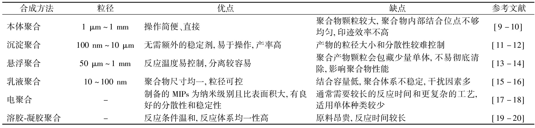 其中本体聚合是制备MIPs最简单的方法[4],该方法具有操作简便、直接等优势。El HARERY等[5]以啶虫脒为模板,4-乙烯基吡啶为单体,采用本体聚合制备MIPs,用于测定水果中的杀虫剂啶虫脒,所制备的印迹界面结构稳定,识别性能良好。检测限和定量限分别为7.35×10-3、0.022 ng/L。但该方法制备MIPs时,存在聚合物内部结合位点不够均匀、识别位点少以及模板分子包埋过深等问题,从而导致MIPs对模板分子的结合能力较差。因此,有研究者开发了溶胶-凝胶聚合等方法,溶胶-凝胶合成可以在室温下完成,具有制备条件温和、反应体系均一性高且所制备的MIPs粒径均一等优点。BHOGAL等[6]通过溶胶-凝胶工艺成功地在SiO2上制备了一种介孔分子印迹聚合物(mesoporous molecularly imprinted polymers,MMIP),用于选择性吸附和检测水中抗生素左氧氟沙星。介孔SiO2材料具有高孔体积和薄的纳米级孔壁厚度,可以在其表面构建精细的识别位点,利用该方法制备的MMIPs对目标物表现出更高的吸附容量,检测限为0.07 ng/mL,回收率高达90.76%~108.17%。但该方法仍未解决识别位点包埋过深和印迹效率低等问题。