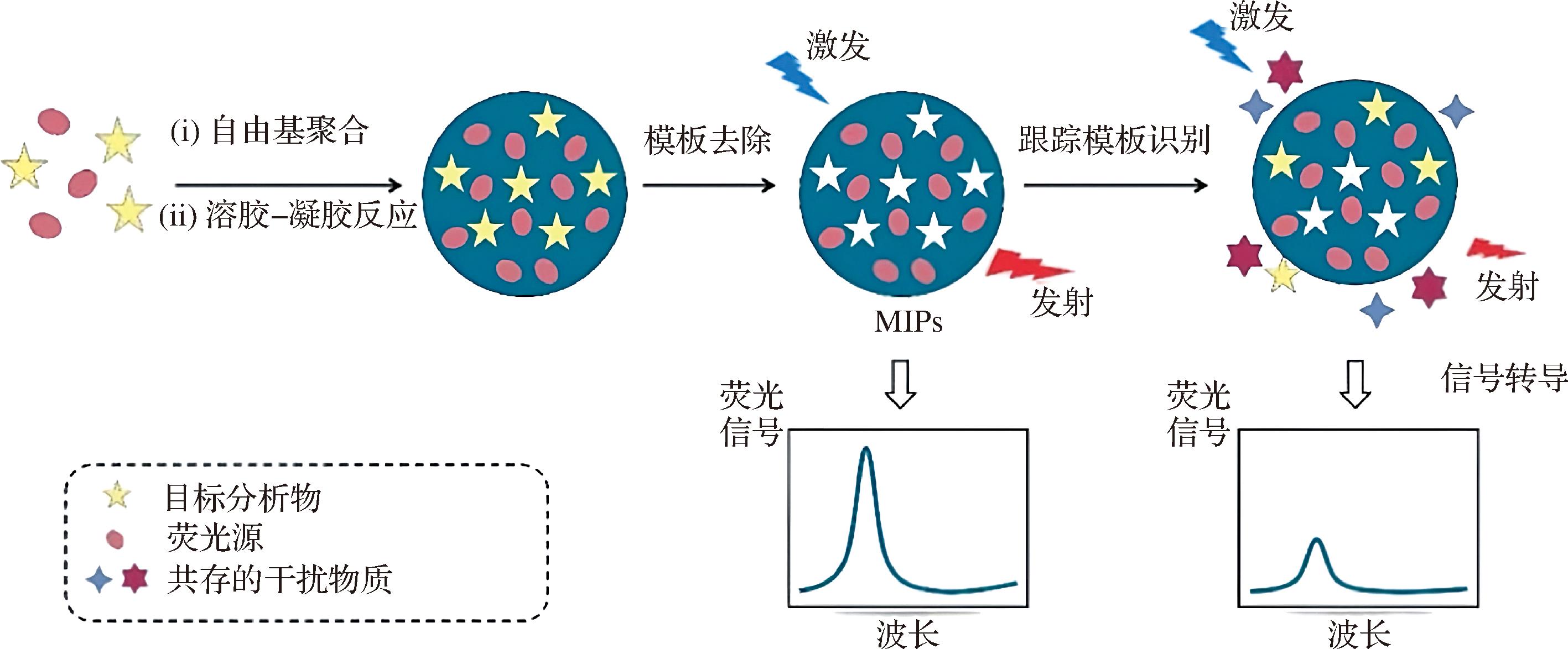 直接荧光检测具有简便、快速等优点,但很少有分析物具有强荧光吸收,对于非荧光分析物通常采用间接荧光法检测。MIF的间接荧光检测首先使用荧光材料制备FIPs,并在靶标印迹后检测荧光信号;其次再制备目标分子荧光标记物,通过竞争结合MIPs特异性位点来定量分析。