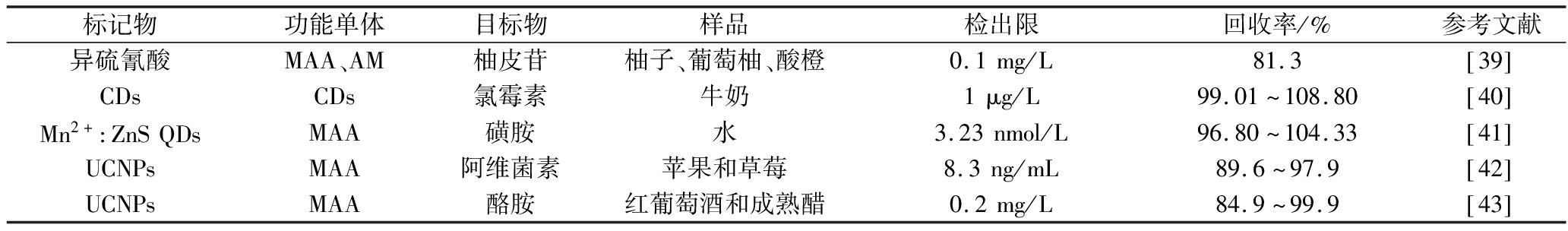 标记物功能单体目标物样品检出限回收率/%参考文献异硫氰酸MAA、AM柚皮苷柚子、葡萄柚、酸橙0.1mg/L81.3 39 CDsCDs氯霉素牛奶1μg/L99.01~108.80 40 Mn2+ ZnSQDsMAA磺胺水3.23nmol/L96.80~104.33 41 UCNPsMAA阿维菌素苹果和草莓8.3ng/mL89.6~97.9 42 UCNPsMAA酪胺红葡萄酒和成熟醋0.2mg/L84.9~99.9 43