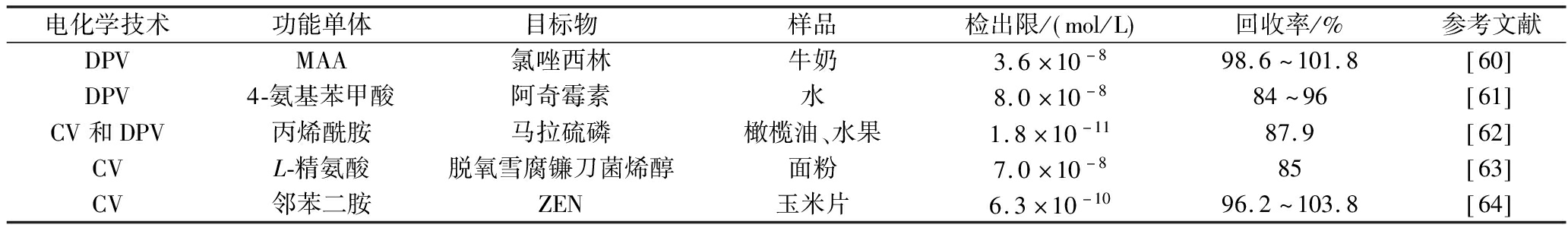 根据检测物质的性质,表5中总结了DPV和循环伏安法(cyclic voltammetry,CV)电化学技术对牛奶和水中氯唑西林等抗生素、水果中马拉硫磷农药残留和谷物中脱氧雪腐镰刀菌烯醇等真菌毒素目标分析物定量分析,DPV适用于对低浓度样品的精确测定,以及对复杂体系中的目标分子进行分离和富集,而CV具有操作简单等优点,结合使用这2种方法可获得更全面的电化学信息。