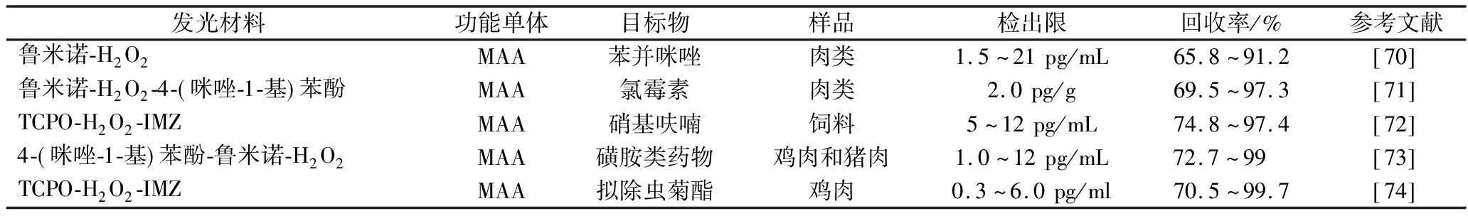 发光材料功能单体目标物样品检出限回收率/%参考文献鲁米诺-H2O2MAA苯并咪唑肉类1.5~21pg/mL65.8~91.2 70 鲁米诺-H2O2-4- 咪唑-1-基 苯酚MAA氯霉素肉类2.0pg/g69.5~97.3 71 TCPO-H2O2-IMZMAA硝基呋喃饲料5~12pg/mL74.8~97.4 72 4- 咪唑-1-基 苯酚-鲁米诺-H2O2MAA磺胺类药物鸡肉和猪肉1.0~12pg/mL72.7~99 73 TCPO-H2O2-IMZMAA拟除虫菊酯鸡肉0.3~6.0pg/ml70.5~99.7 74
