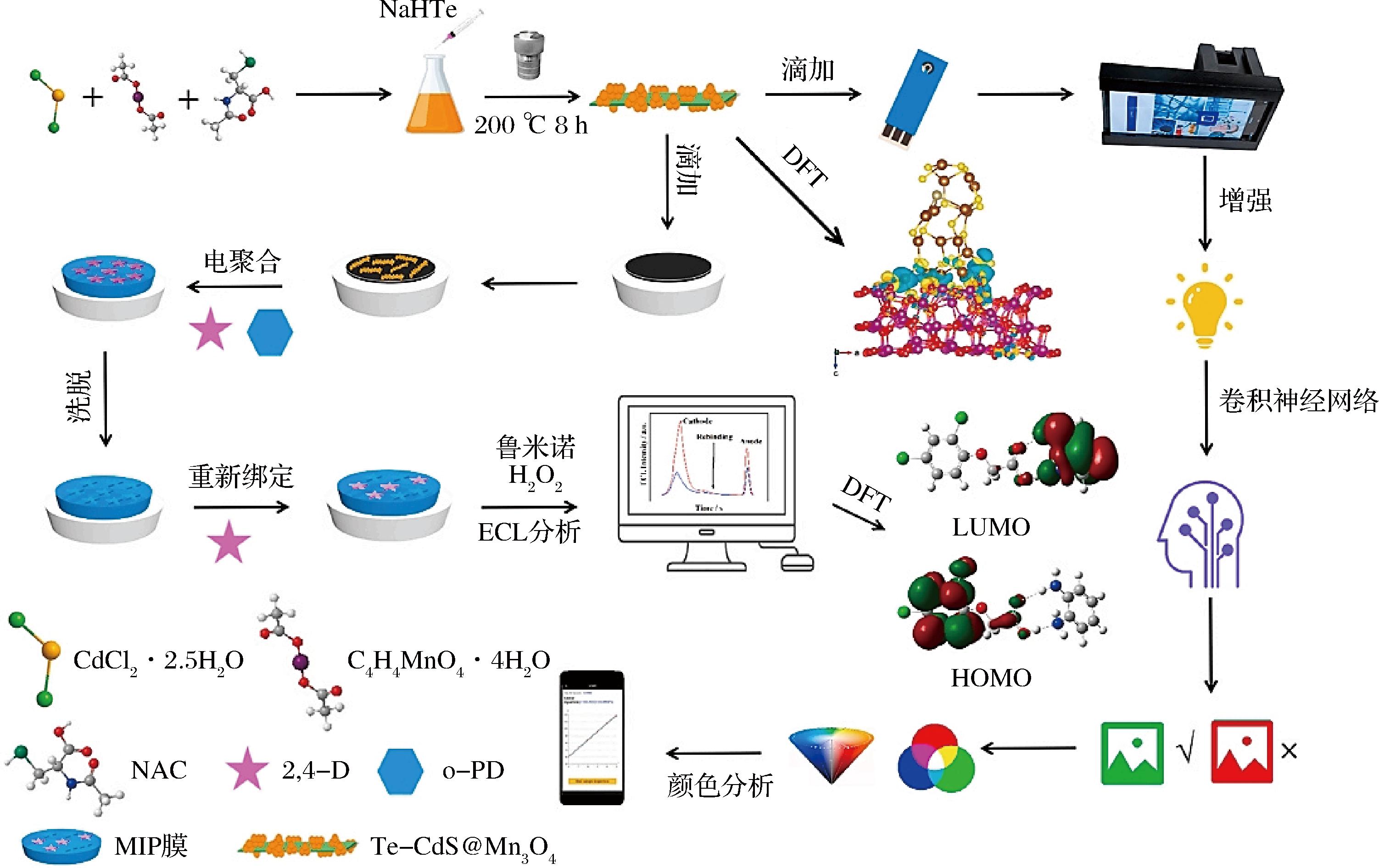 ECL传感器存在发光信号单一、系统误差大和现场分析能力较低等问题。基于双信号的比率测量策略与智能手机相结合有效地解决了这些问题。LU等[68]首次构建了一种新型便携式机器学习辅助智能手机视觉分子印迹比率电化学发光(molecularly imprinted ratiometric electrochemiluminescence,MIRECL)传感平台,用于高选择性检测蔬菜水果中2,4-二氯苯氧乙酸(2,4-dichlorophenoxyacetic acid,2,4-D)。以Te-CdS@Mn3O4修饰的MIPs为识别元件,通过阴极电聚合改性后进行靶标检测,在驱动电压和H2O2的作用下,鲁米诺的阳极氧化和Te-CdS@Mn3O4的阴极还原同时发生,产生具有2种特征的ECL发射信号。当MIPs特异性识别2,4-D后,双ECL信号随着2,4-D浓度的增加而降低,借助智能手机收集和处理数据,实现对2,4-D定量检测,检测限为0.63×10-3 μmol/L(图6)。该研究将比率电化学发光策略与MIT相结合,可通过2个发光体的内部自校准来降低误差;将人工智能与ECL分析相结合,可用于ECL视觉分析,进而实现可视化和便携式检测性能,为2,4-D的即时检测提供了一种新颖、便携、可视和高效的方法。