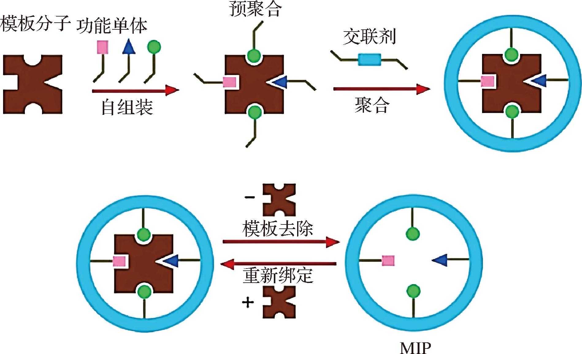 MIPs是一种稳定且低成本的抗体替代物,与传统生物源抗体相比,其表面具有多个结合位点,可以选择性地识别目标分子。作为BIA的识别元件,其界面的结构和性能是影响检测分析的重要因素,构建性能良好的MIPs印迹界面是BIA的关键。MIPs主要由模板、功能单体和交联剂通过自由基聚合反应,MIP制备的技术流程见图1,具体制备方法有本体聚合、溶胶-凝胶聚合、溶液聚合和乳液聚合等[2]。
