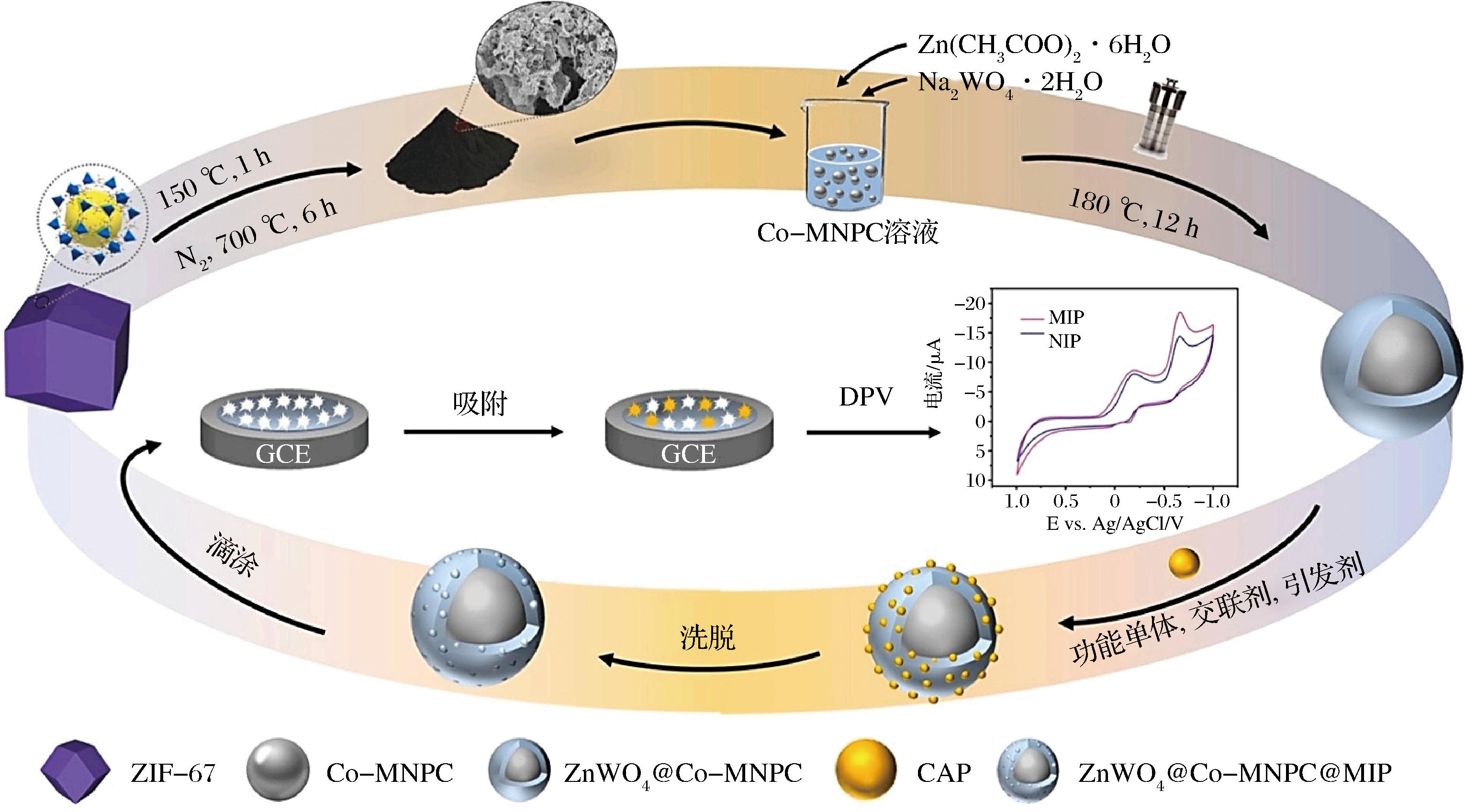 纳米结构涂层和基于MIPs的纳米材料的预组装被进一步用于开发改性电极,进而提高传感检测方法的性能、MIPs膜的比表面积和导电性,增强传感器的灵敏度和响应速度。YAO等[56]通过沉淀聚合在ZnWO4@Co-磁性纳米多孔碳(ZnWO4@Co-magnetic nanoporous carbon,ZnWO4@Co-MNPC)表面涂覆MIPs外壳,构建了以ZnWO4@Co-MNPC@MIP为核心的新型抗生素氯霉素(chloramphenicol,CAP)电化学传感器(图5)。ZnWO4能够提高电导率,Co-MNPC具有较高的比表面积和大孔体积,Co纳米颗粒具有强磁性,容易吸附功能单体,促进聚合反应,基于此构建的传感器具有较高的灵敏度,检测限为0.002 7 μmol/L。该研究首次将MMIPs用于牛奶中CAP的检测,为制备磁性分子印迹提供了有效的磁性材料选择策略,也为Co-MNPC磁性纳米材料的应用拓宽了思路。