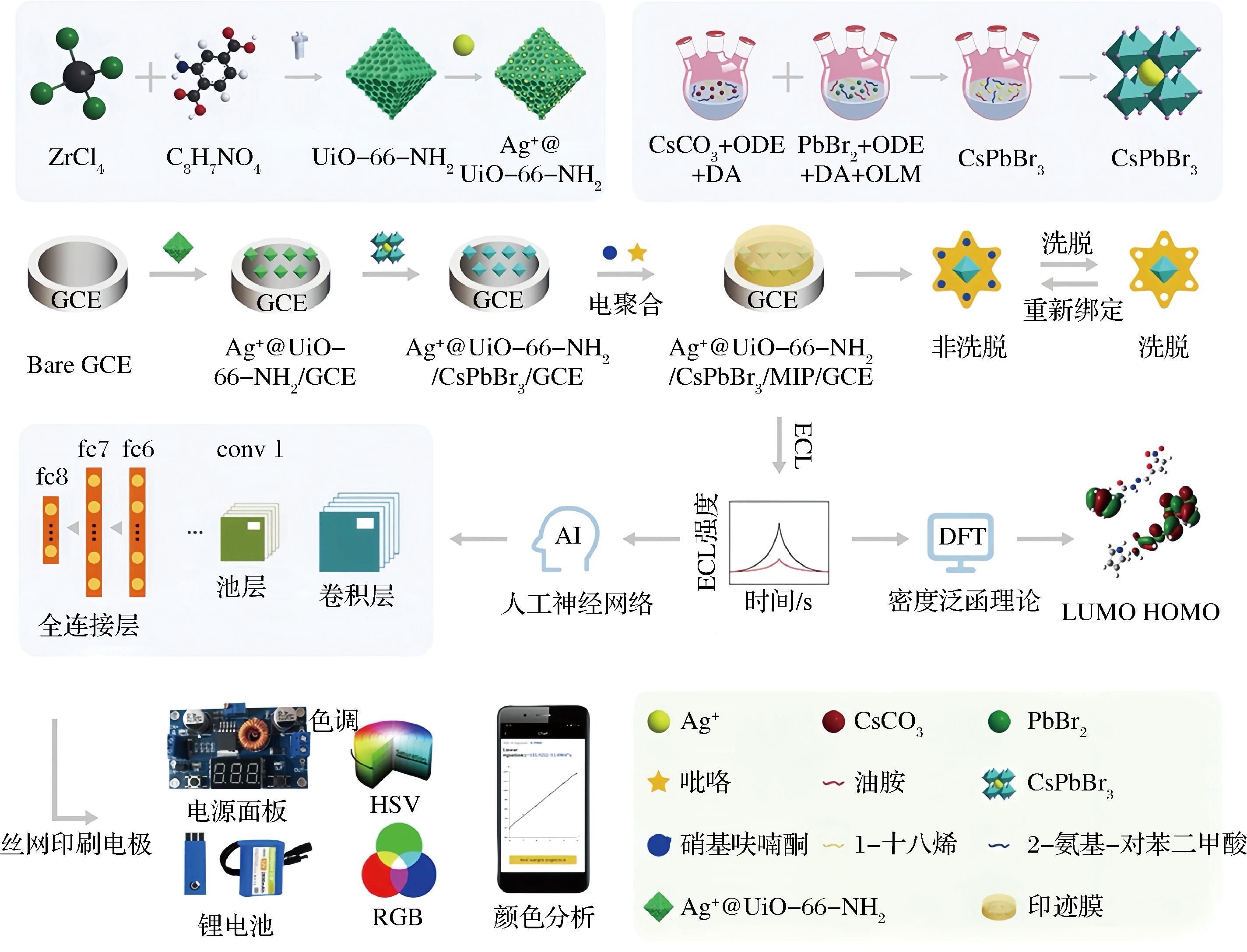 图8 基于便携式智能手机ECL-MIP系统的Ag+@UiO-66-NH2/CsPbBr3/MIP/GCE构建方法、机器学习优化与传感识别过程[80]