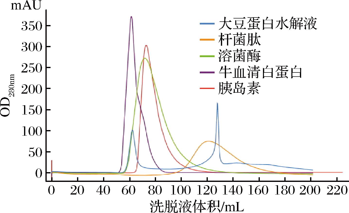 采用Sephadex G25凝胶柱(φ1.6×80 cm),用pH 8.5,0.05 mol/L Tris-HCl缓冲液平衡柱子;上样2.5 mL大豆蛋白水解液。用上述缓冲液洗脱,流速为1.5 mL/min。检测洗脱液在280 nm吸光值的变化。将洗脱图谱与肽标样的洗脱图谱进行比较,分析大豆蛋白水解液中肽段的分布情况。