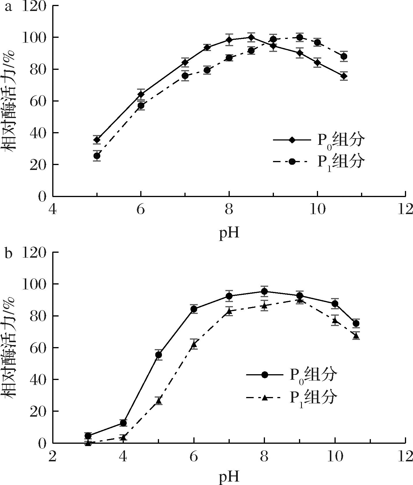 图6-b的结果显示,短小芽孢杆菌蛋白酶P0组分在pH 6~10的范围有较好的稳定性,P1组分在pH 7~10范围内有相对较好的稳定性;在酸性条件下,尤其是当pH<5.0时,2种蛋白酶组分均会变性失活;相比而言,蛋白酶P0组分的稳定性要略优于P1组分,在酸性环境中其相对酶活力均高P1组分。