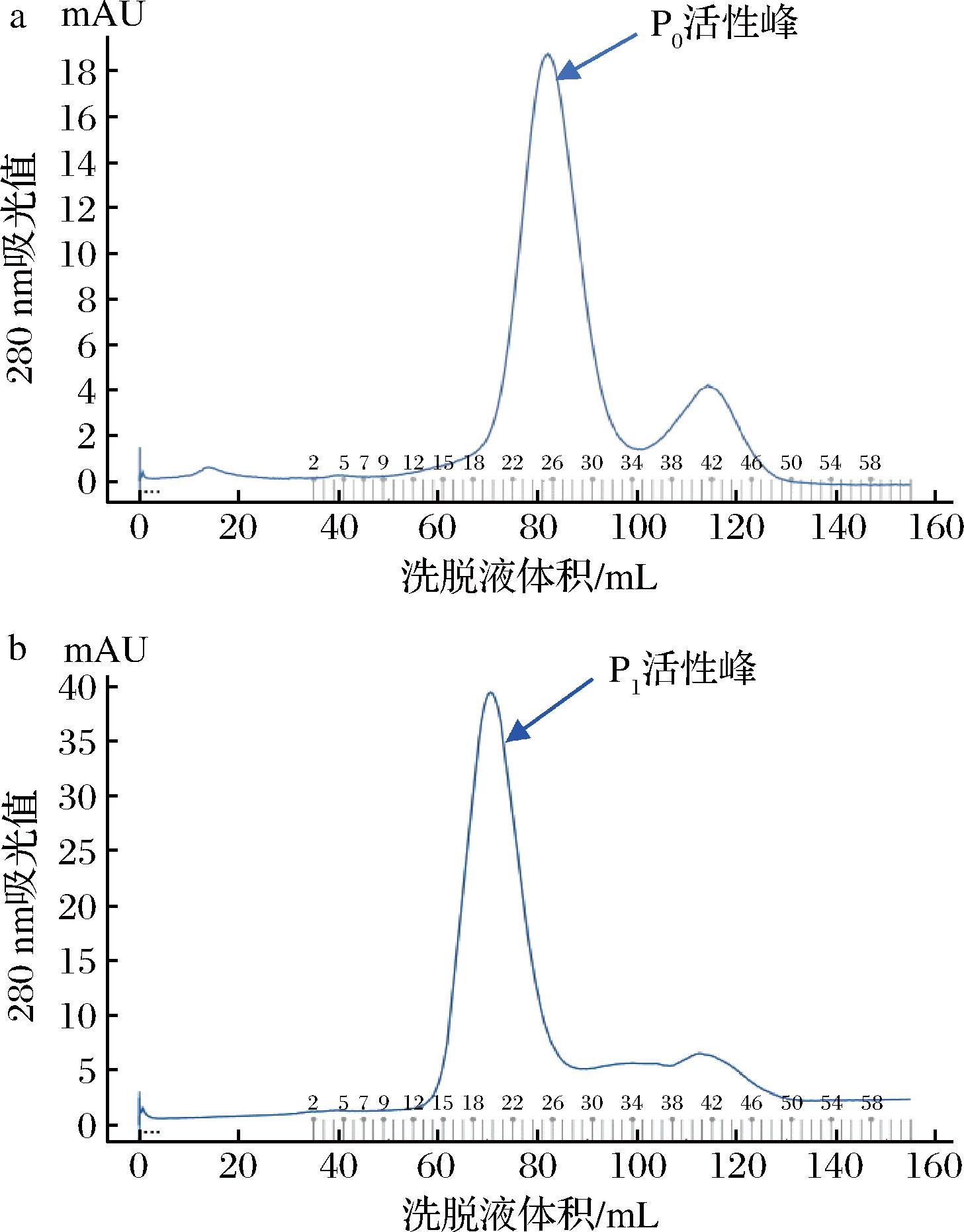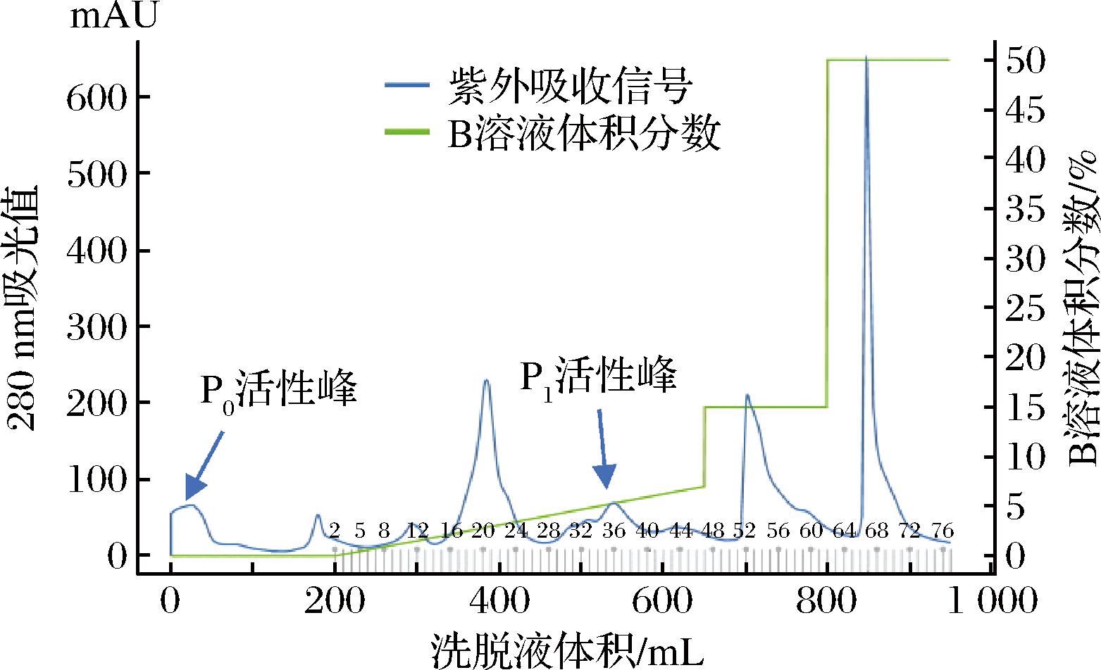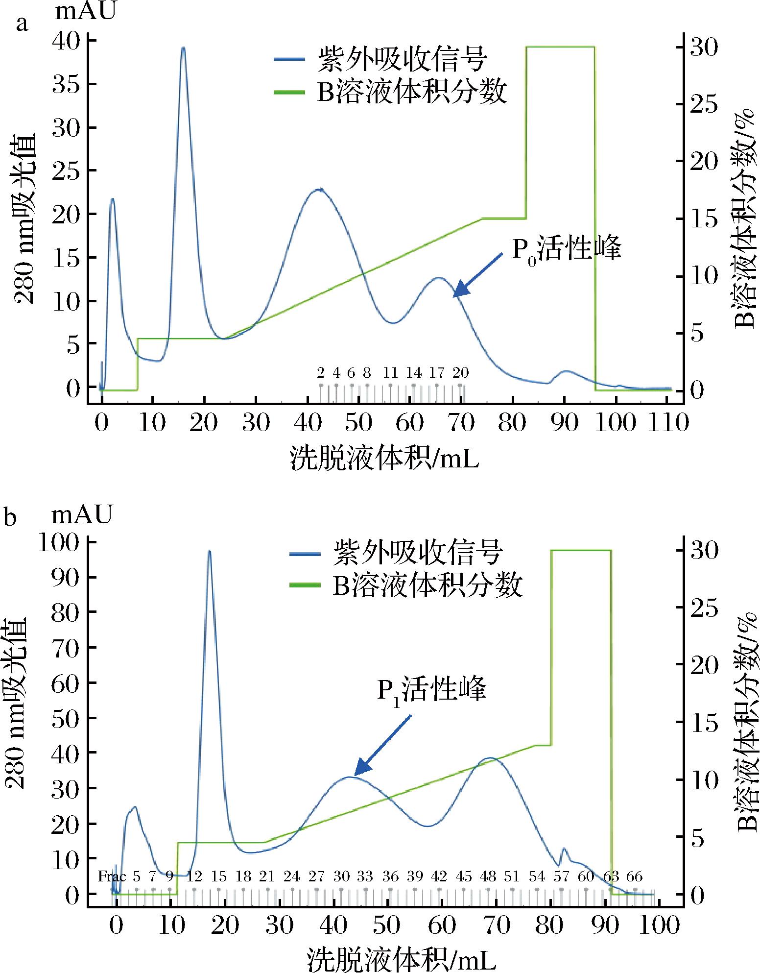 随后,利用阳离子交换层析对P0和P1组分进行了纯化,在pH 5.5的条件下2种组分均可以被树脂吸附(图2),通过优化洗脱条件实现了蛋白酶组分与杂蛋白的分离;最后采用G75凝胶层析进一步纯化2种蛋白酶组分。