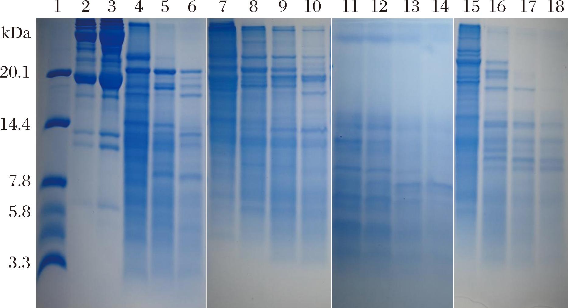 1-Marker;2、3-大豆分离蛋白;4~6-大豆蛋白胰蛋白酶水解液;7~10-大豆蛋白枯草杆菌蛋白酶水解液;11~14-大豆蛋白alcalase水解液;15~18-大豆蛋白短小芽孢杆菌蛋白酶P0水解液;水解时间分别为10 min,1 h,3 h,6 h。