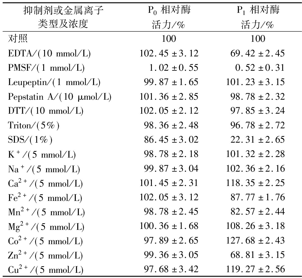 抑制剂或金属离子类型及浓度P0相对酶活力/%P1相对酶活力/%对照100100EDTA/ 10mmol/L 102.45±3.1269.42±2.45PMSF/ 1mmol/L 1.02±0.550.52±0.31Leupeptin/ 1mmol/L 99.87±1.65101.23±3.15PepstatinA/ 10μmol/L 101.36±2.8598.78±2.32DTT/ 10mmol/L 102.05±2.1297.85±3.24Triton/ 5% 98.36±2.4896.78±2.72SDS/ 1% 86.45±3.0222.31±2.65K+/ 5mmol/L 98.78±2.18101.32±2.28Na+/ 5mmol/L 99.87±3.04102.36±2.16Ca2+/ 5mmol/L 101.45±2.31118.35±2.25Fe2+/ 5mmol/L 102.05±3.1287.77±1.76Mn2+/ 5mmol/L 98.78±2.4582.57±2.44Mg2+/ 5mmol/L 100.36±1.68108.26±3.18Co2+/ 5mmol/L 97.89±2.65127.68±2.43Zn2+/ 5mmol/L 99.36±3.0568.81±3.15Cu2+/ 5mmol/L 97.68±3.42119.27±2.56