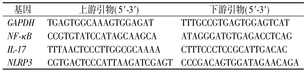 基因上游引物 5′-3′ 下游引物 5′-3′ GAPDHTGAGTGGCAAAGTGGAGATTTTGCCGTGAGTGGAGTCATNF-κBCCGTGTATCCATAGCAAGCAATAGGGATGTGAGACCTCAGIL-17TTTAACTCCCTTGGCGCAAAACTTTCCCTCCGCATTGACACNLRP3CGTGACTCCCATTAAGATCGAGTCCCGACAGTGGATAGAACAGA