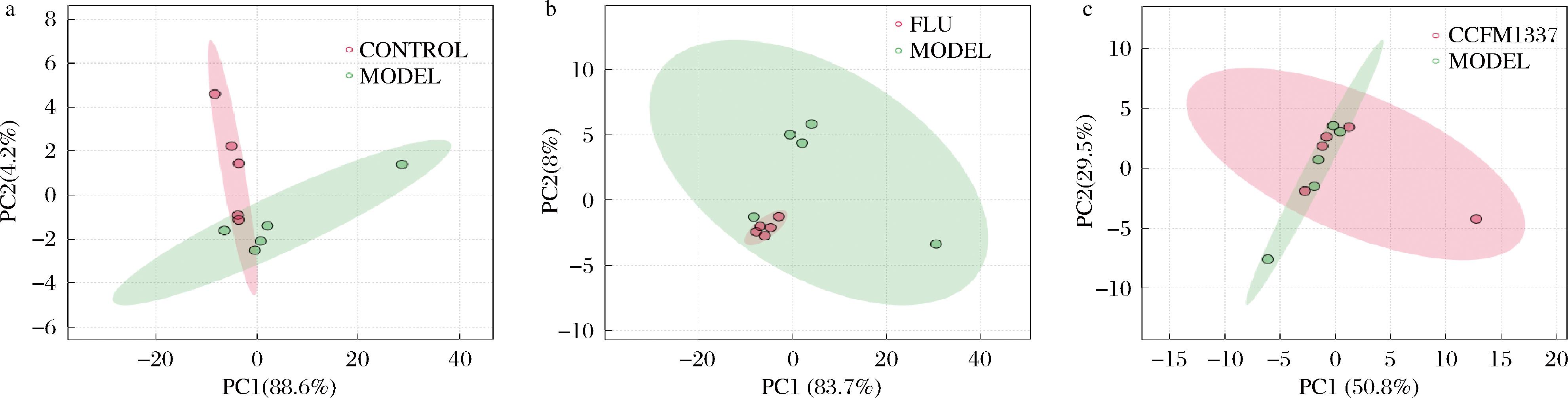 为了进一步探究口服CCFM1337对于小鼠阴道组织代谢物的影响,本研究基于LC-MS非靶代谢组学,测定了小鼠阴道组织的代谢物变化情况。将下机结果正负离子的特征峰与数据库进行比对、鉴定,所得代谢物使用Metaboanalyst网站进行主成分分析(principal component analysis,PCA),结果显示使用C.albicans造模使得小鼠阴道代谢物组成与空白组小鼠发生了明显分离,说明C.albicans感染导致小鼠阴道代谢紊乱(图5-a),CCFM1337干预组与模型组的代谢轨迹差异较大(图5-c),而氟康唑相对较小(图5-b),说明了CCFM1337干预具有更显著的代谢重塑能力。