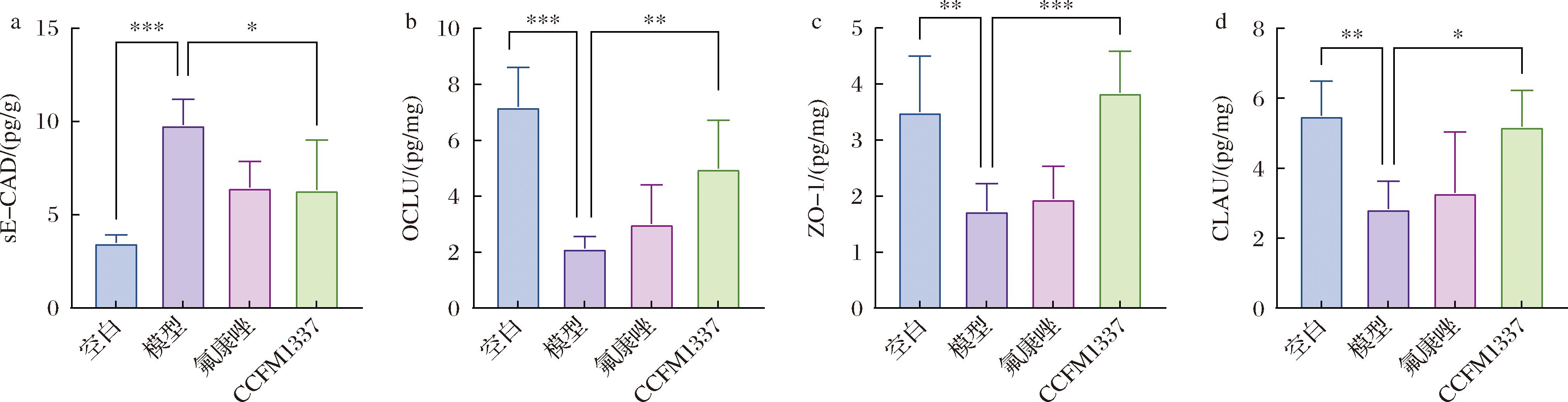 本研究首先通过HE染色直观观察小鼠阴道组织的炎症情况及上皮完整性。由图2-a可知,空白组小鼠阴道上皮角质层比较光滑、连续,并且完整,无坏死脱落现象,棘层细胞紧密连接;而模型组小鼠角质层细胞变性,棘层受到C.albicans侵染,中性粒细胞浸润形成微脓肿,并可见炎性细胞浸润(图2-b),这可能与C.albicans通过β-葡聚糖激活Dectin-1受体介导的Th17型免疫反应密切相关[19];而CCFM1337干预后,小鼠阴道角质层连续完整性提升,棘层细胞微脓肿消失,炎性细胞浸润现象消失(图2-d),其效果优于氟康唑(图2-c),这可能与其分泌的短链脂肪酸表现出的抗炎作用及其对紧密连接蛋白表达的恢复有关[20]。
