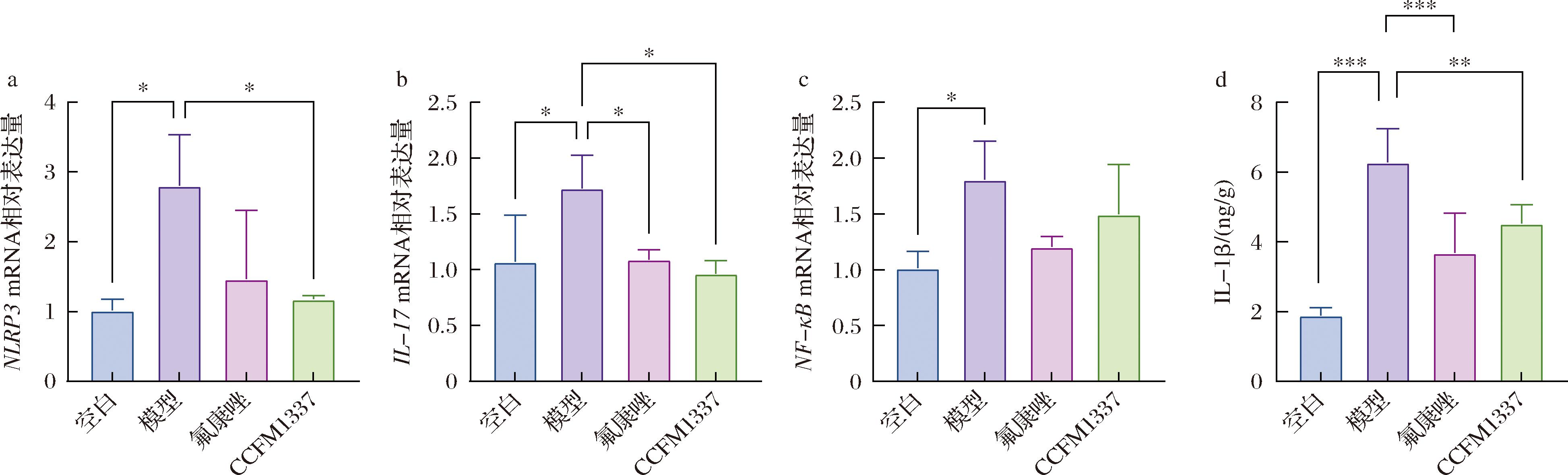 NLRP3炎症小体在机体抵御念珠菌感染中有着重要作用,能够被C.albicans分泌的SAP激活,进而促进pro-IL-1β裂解释放IL-1β,并激活Th17细胞释放IL-17,其中IL-17能够诱导抗菌肽分泌促进阴道黏膜对C.albicans的防御;同时IL-1β、IL-17以及构成真菌细胞壁的β-葡聚糖、几丁质等成分均能激活机体内的关键转录因子NF-κB,这一转录因子能够调控多种基因,同时介导内皮屏障破坏[3,22-24]。如图4所示,模型组小鼠阴道组织中NLRP3 mRNA表达上调2.75倍(P<0.05),下游IL-1β(P<0.001)、IL-17(P<0.05)、NF-κB(P<0.05)mRNA表达同步提高;经过CCFM1337的干预,NLRP3(P<0.05)、IL-1β(P<0.01)、IL-17(P<0.05)分别下降了2.37倍、1.39倍和1.79倍,推测这可能是CCFM1337的代谢产物对于SAP的抑制作用;同时NF-κB虽然表现出下降趋势,但是无统计学差异,这可能是由于NF-κB受到多种通路调控,而其他通路的激活抵消了上述抑制作用。有研究表明,念珠菌溶血素能够以剂量依赖式诱导IL-1β的分泌,加剧组织炎症损伤[4,25],炎症因子的表达水平与阴道微生态的平衡密切相关,阴道微生态的破坏会进一步破坏阴道上皮屏障的完整性及其功能性[26],而CCFM1337能够调节炎症相关指标的表达水平,修复被C.albicans破坏的阴道上皮屏障,增强对病原菌的抵抗能力。