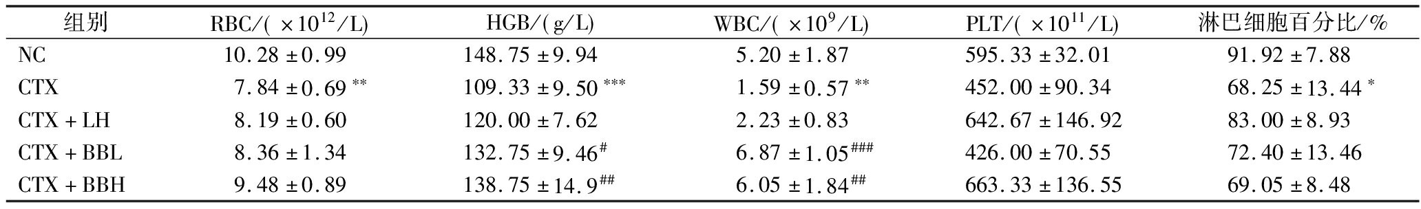 组别RBC/ ×1012/L HGB/ g/L WBC/ ×109/L PLT/ ×1011/L 淋巴细胞百分比/%NC10.28±0.99148.75±9.945.20±1.87595.33±32.0191.92±7.88CTX7.84±0.69∗∗109.33±9.50∗∗∗1.59±0.57∗∗452.00±90.3468.25±13.44∗CTX+LH8.19±0.60120.00±7.622.23±0.83642.67±146.9283.00±8.93CTX+BBL8.36±1.34132.75±9.46#6.87±1.05###426.00±70.5572.40±13.46CTX+BBH9.48±0.89138.75±14.9##6.05±1.84##663.33±136.5569.05±8.48