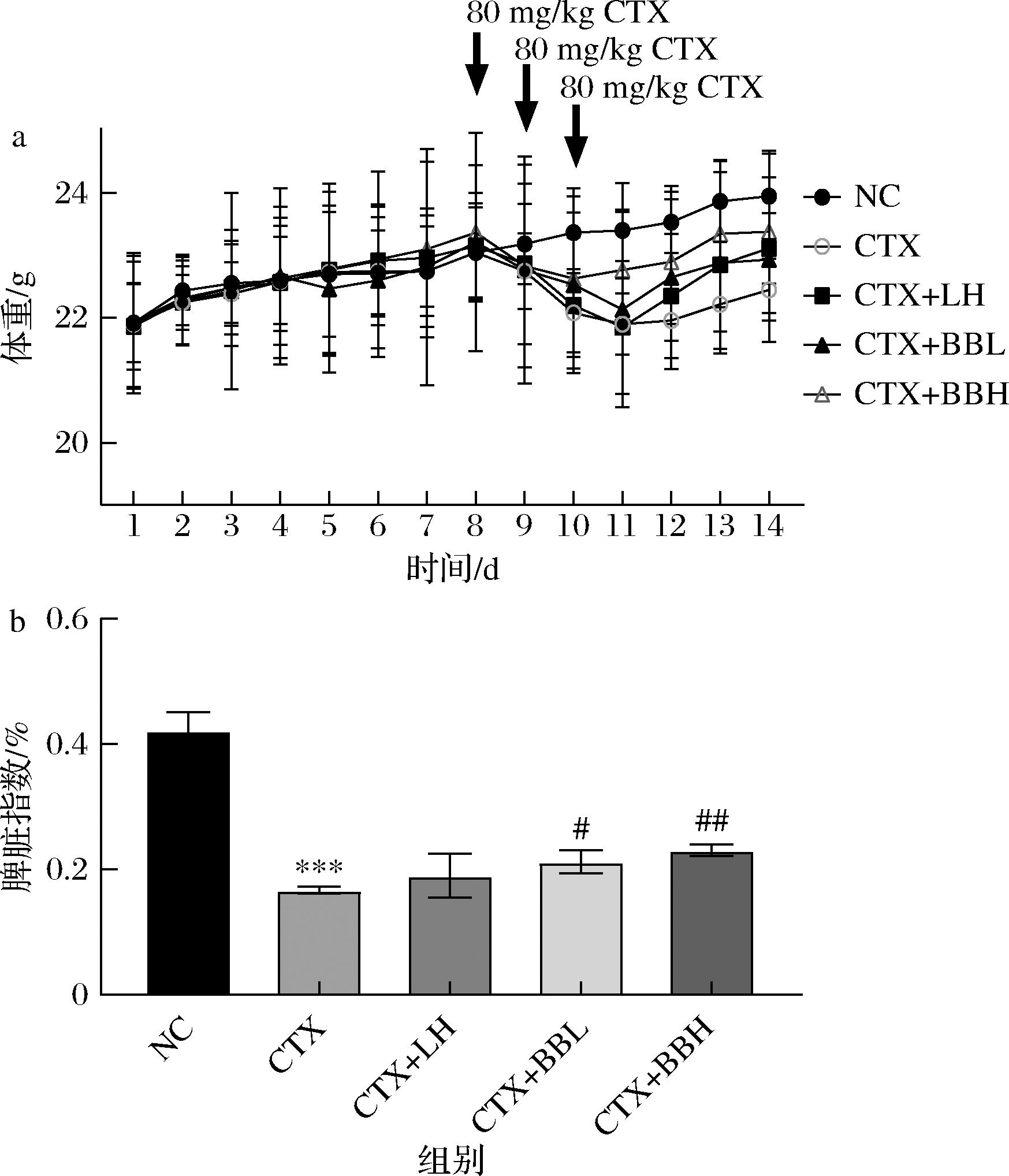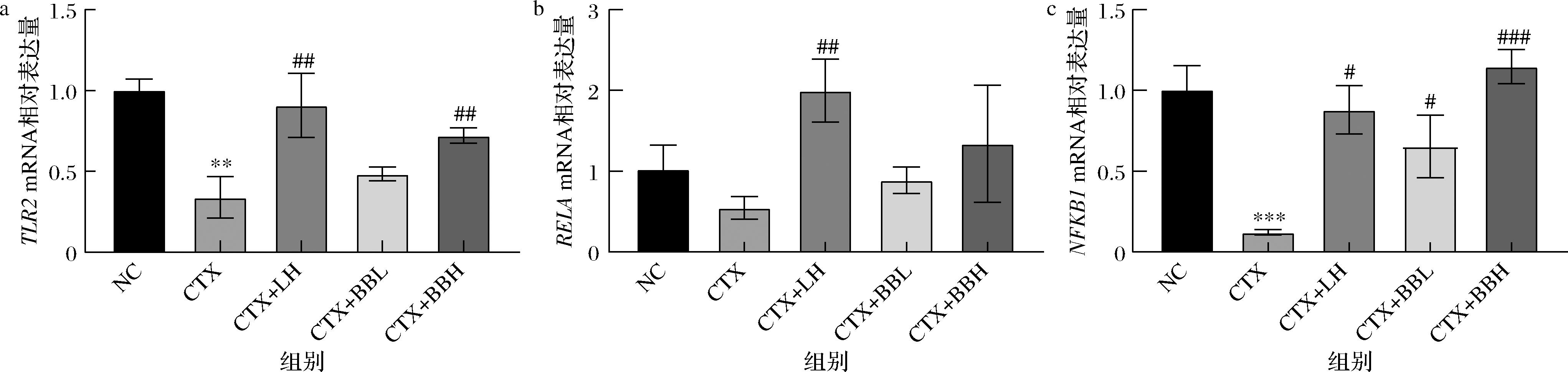 注:与NC组比具有显著性差异,*,P<0.05;**,P<0.01;***,P<0.001;与CTX组相比具有显著性差异,#,P<0.05;##,P<0.01;###,P<0.001(下同)。