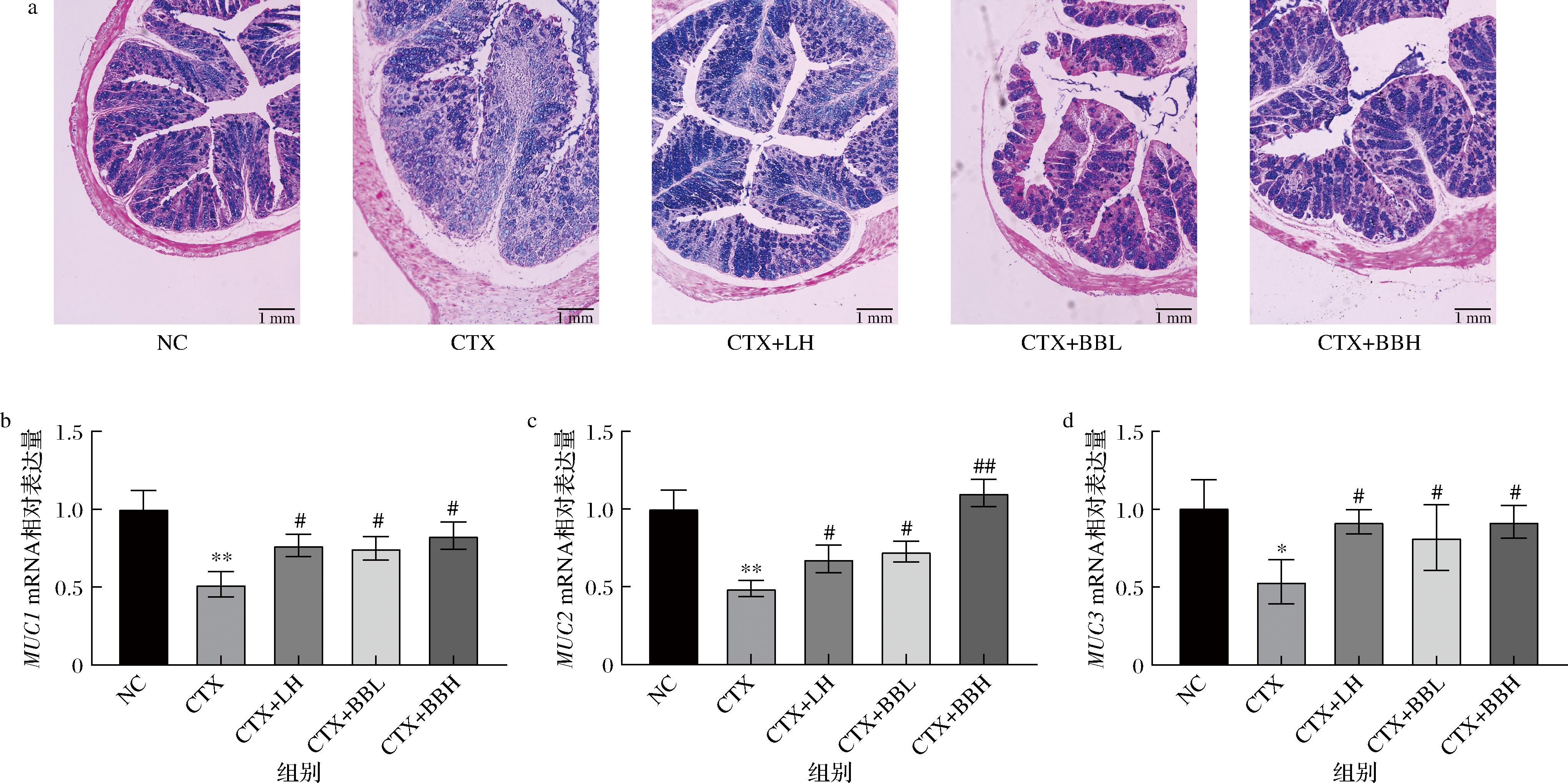 粘蛋白是由杯状细胞合成并分泌的高分子质量糖蛋白,是肠道黏膜屏障的关键组成部分,黏液形成的物理屏障,抵御外部刺激。IOB LO7后生元对免疫功能低下小鼠肠道黏膜屏障的影响结果如图8所示,与NC组相比,CTX组小鼠结肠部分有明显的炎症浸润。与CTX组相比,CTX+BBL组的结肠组织仍有少量炎症浸润,CTX+LH、CTX+BBH组的结肠组织相对完整,同时杯状细胞明显多于CTX组。与NC组相比,CTX组MUC1(P<0.01)、MUC2(P<0.01)、MUC3(P<0.05)的mRNA水平显著降低;与CTX组相比,CTX+LH组(P<0.05)和CTX+BBL组(P<0.05)MUC1、MUC2、MUC3的mRNA水平均显著升高,CTX+BBH组MUC1(P<0.05)、MUC2(P<0.01)、MUC3(P<0.05)的mRNA水平均有显著升高(图8)。结果表明,IOB LO7后生元能够维持肠道黏膜屏障,提高黏蛋白表达,减少炎症细胞浸润,维持肠道的稳态。