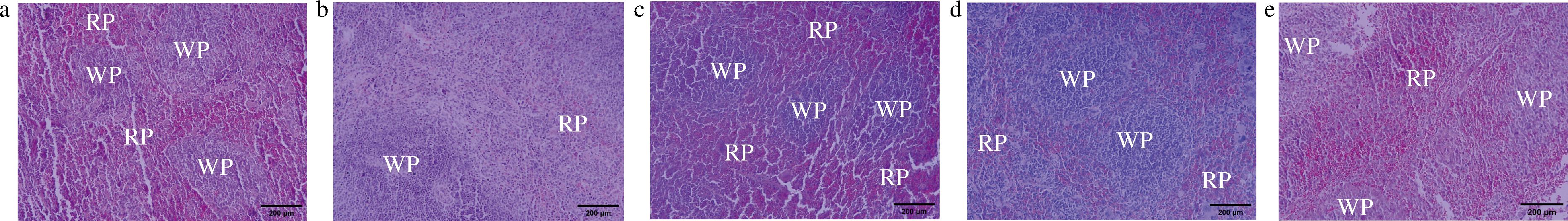 小鼠脾脏组织HE染色结果如图4所示,与NC组相比,CTX组小鼠脾脏结构紊乱,白髓(white pulp,WP)与红髓(red pulp,RP)边界模糊。与CTX组相比,CTX+BBH组能恢复脾脏组织的结构,WP与RP边界清晰,与CTX+LH组相似。结果表明,IOB LO7后生元通过恢复脾脏结构区室来保护脾脏功能。