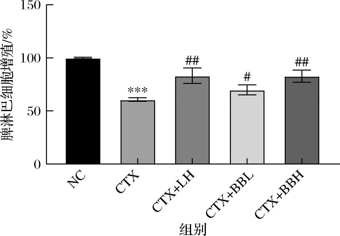 IOB LO7后生元对免疫功能低下小鼠脾淋巴细胞增殖的影响结果如图5所示,与NC组相比,CTX组的脾淋巴增殖能力显著下降(P<0.001);与CTX组相比,CTX+LH组与CTX+BBH组的脾脏淋巴细胞增殖的能力极显著升高(P<0.01),CTX+BBL组脾脏淋巴细胞增殖的能力显著升高(P<0.05)。结果表明,IOB LO7后生元可能通过促进脾淋巴细胞增殖来改善免疫抑制。