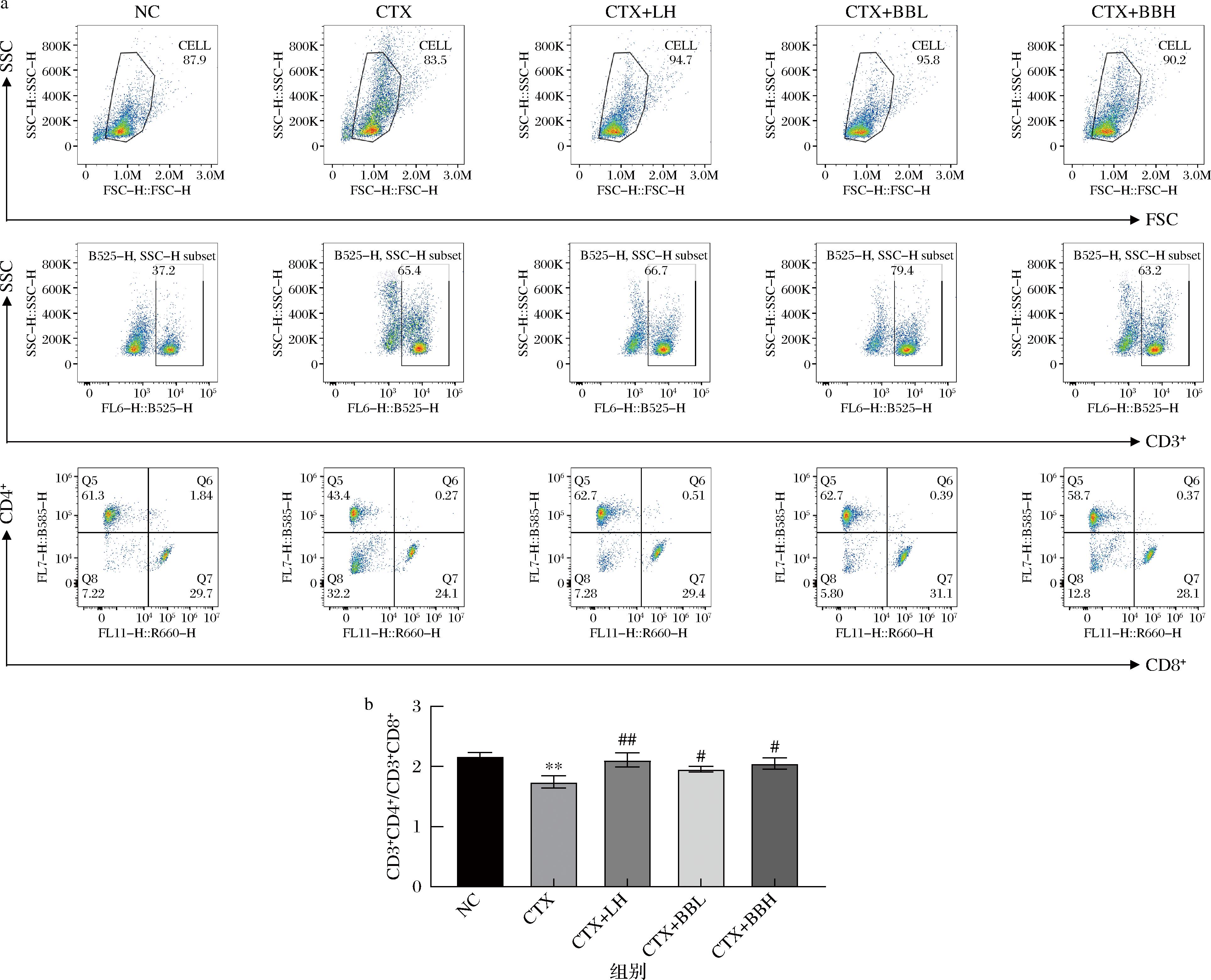 a-脾淋巴细胞圈门图;b-CD3+CD4+/CD3+CD8+T细胞的比值