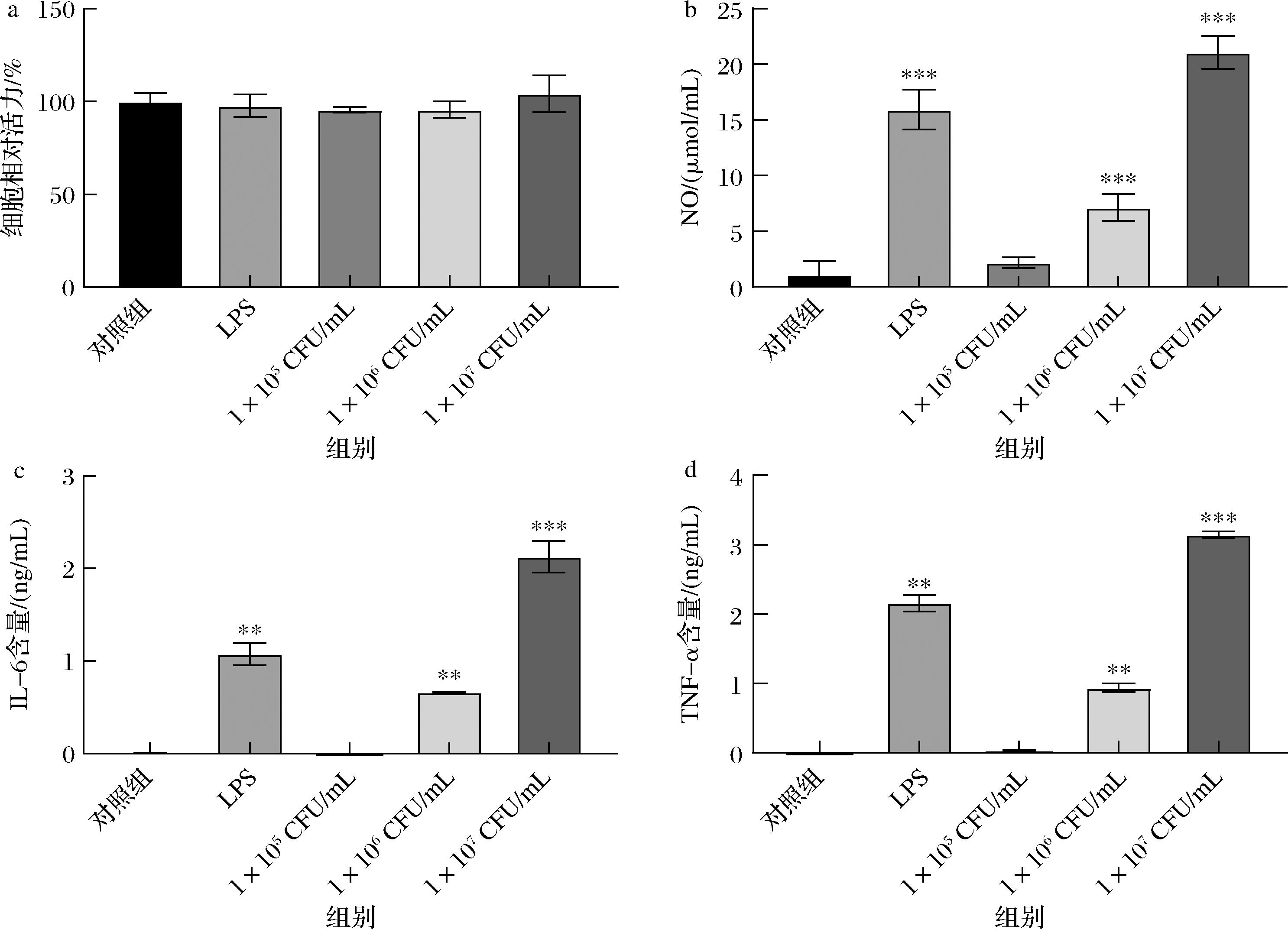 小鼠巨噬细胞RAW264.7培养于体积分数为10%胎牛血清的高糖型DMEM培养基,置于5% CO2、湿度为95%、37 ℃的恒温细胞培养箱。将细胞接种(1×104 细胞/孔)于96孔板中,过夜培养,分别加入终质量浓度为0.1 μg/mL LPS及1×105、1×106、1×107 CFU/mL的IOB LO7后生元孵育24 h,加入0.5 mg/mL的MTT溶液孵育4 h后,加入二甲亚砜(dimethyl sulfoxide,DMSO)溶解,使用酶标仪测量490 nm处吸光度。Gress法检测细胞上清液培养基中NO的含量,ELISA试剂盒检测细胞上清液培养基中IL-6、TNF-α的含量。
