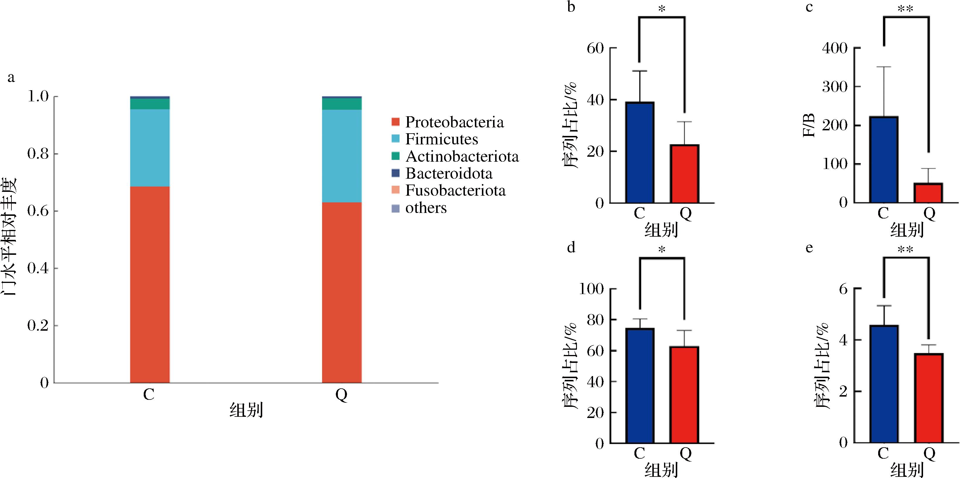 图4展示了QA干预后在门水平上的肠道菌群组成变化。微生物群落结构分析表明,厚壁菌门(Firmicutes)、拟杆菌门(Bacteroidetes)和变形菌门(Proteobacteria)在Q组与C组中构成优势菌群,其累积相对丰度显著高于其他分类单元。其中,Firmicutes和Bacteroidetes的相对丰度变化尤为明显(图4-a),这一结果与GAO等[21]的研究一致,他们发现多酚类化合物能够显著调节肠道菌群的组成,特别是对Firmicutes和Bacteroidetes的影响。此外,Firmicutes的相对丰度在QA干预后显著降低(图4-b),且F/B比值在QA干预后也显著降低(图4-c)。而F/B值是评价肠道菌群平衡的重要指标,其降低表明肠道菌群的平衡状态得到了改善[22]。这表明QA可能通过调节肠道菌群的组成来影响肥胖人群的代谢状态。通过图4-d~图4-e发现,Proteobacteria和放线菌门(Actinobacteria)的相对丰度显著降低,由于Proteobacteria中包含多种与肠道炎症密切相关的条件致病菌(如大肠杆菌、沙门氏菌等),因此该结果表明,QA可能通过特异性降低变形菌门的相对丰度来减轻肠道炎症反应,进而改善肥胖人群的肠道微生态平衡。值得注意的是,观察到与多数体内研究普遍揭示的Firmicutes和Bacteroidetes作为主要细菌门类不同,Proteobacteria在体外发酵实验体系中占据了最高比例。推测,这一显著差异可能源于体外缺乏宿主免疫调节、肠道蠕动和胆汁酸等生理条件,改变了菌群竞争关系,且体外发酵可能诱导氧化应激,而Proteobacteria在应激条件下易过度生长[23]。