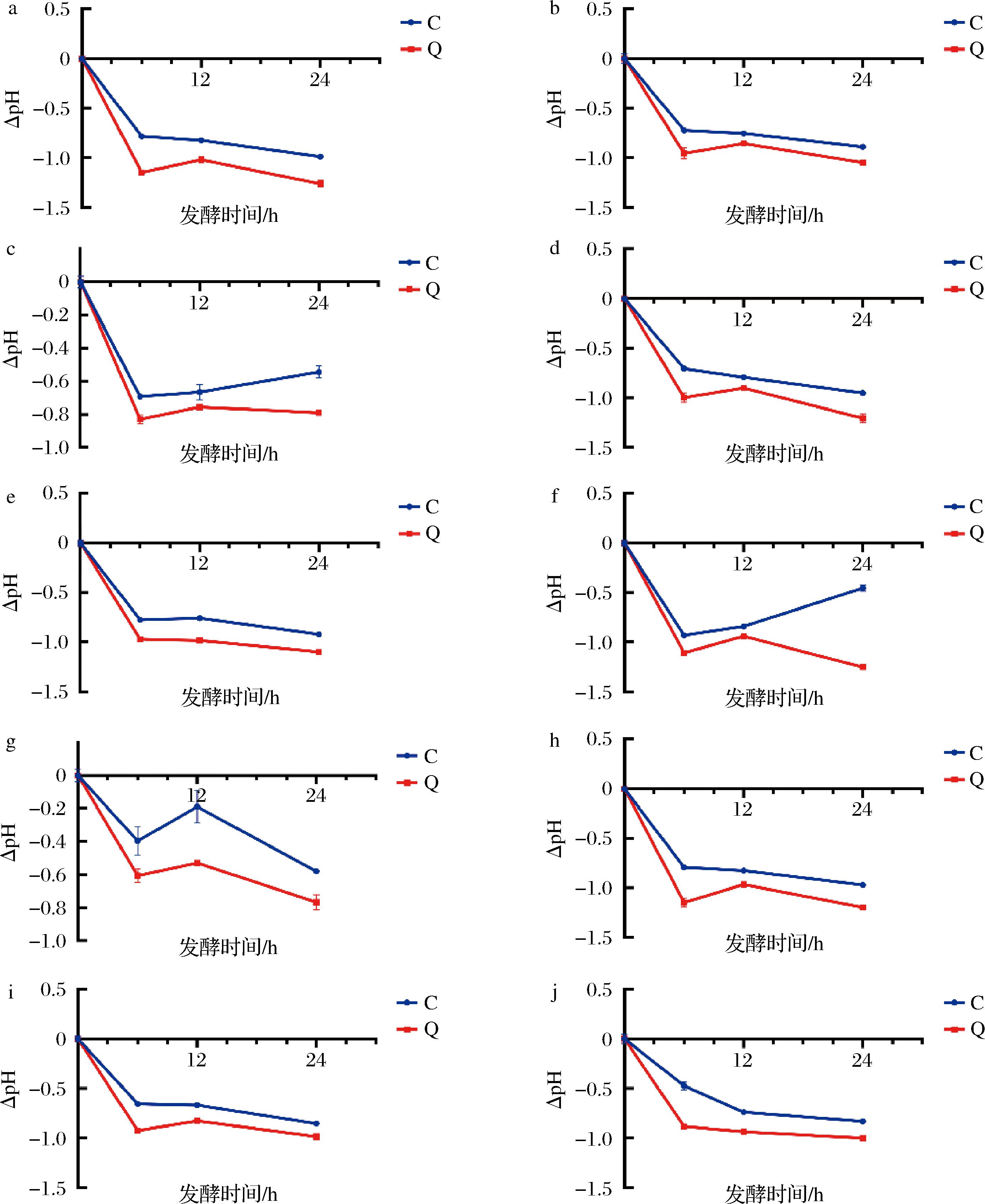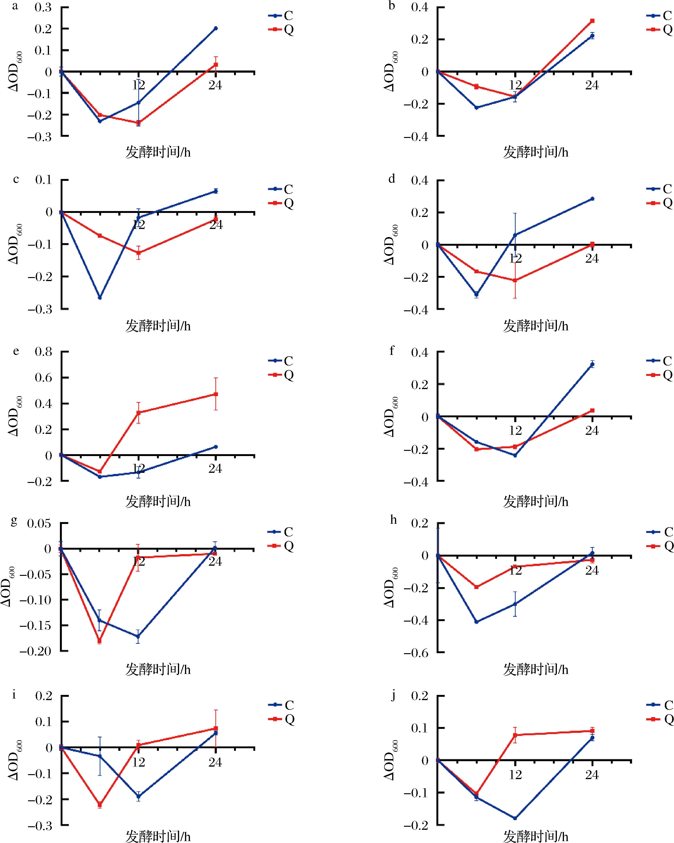 体外发酵模型构建:取预处理菌悬液4 mL与缓冲基质16 mL(碳酸盐-磷酸盐缓冲体系,pH 7.0)于50 mL发酵容器中构建混合体系。实验设置两组平行体系:对照组(C组)、奎宁酸组(Q组),其中Q组添加QA至终质量浓度2 mg/mL,C组维持等体积无菌生理盐水。分别在0、6、12、24 h测量发酵液的OD600与pH,同时在发酵24 h后取2 mL样品10 000×g离心10 min,收集沉淀进行微生物分析,收集剩余发酵液进行后续分析。