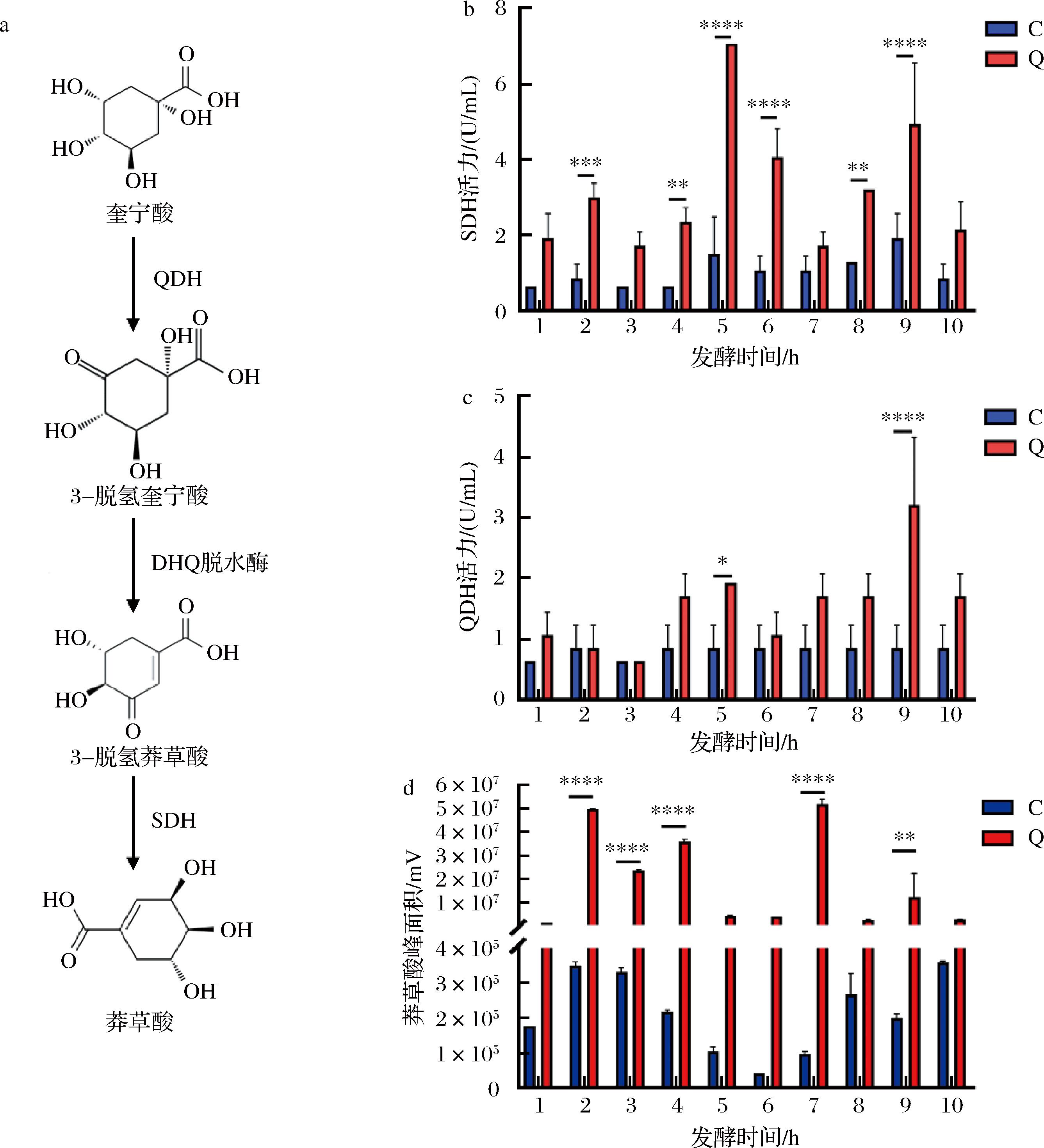 a-QA转化为莽草酸的代谢途径;b-SDH活力;c-QDH活力;d-莽草酸峰值