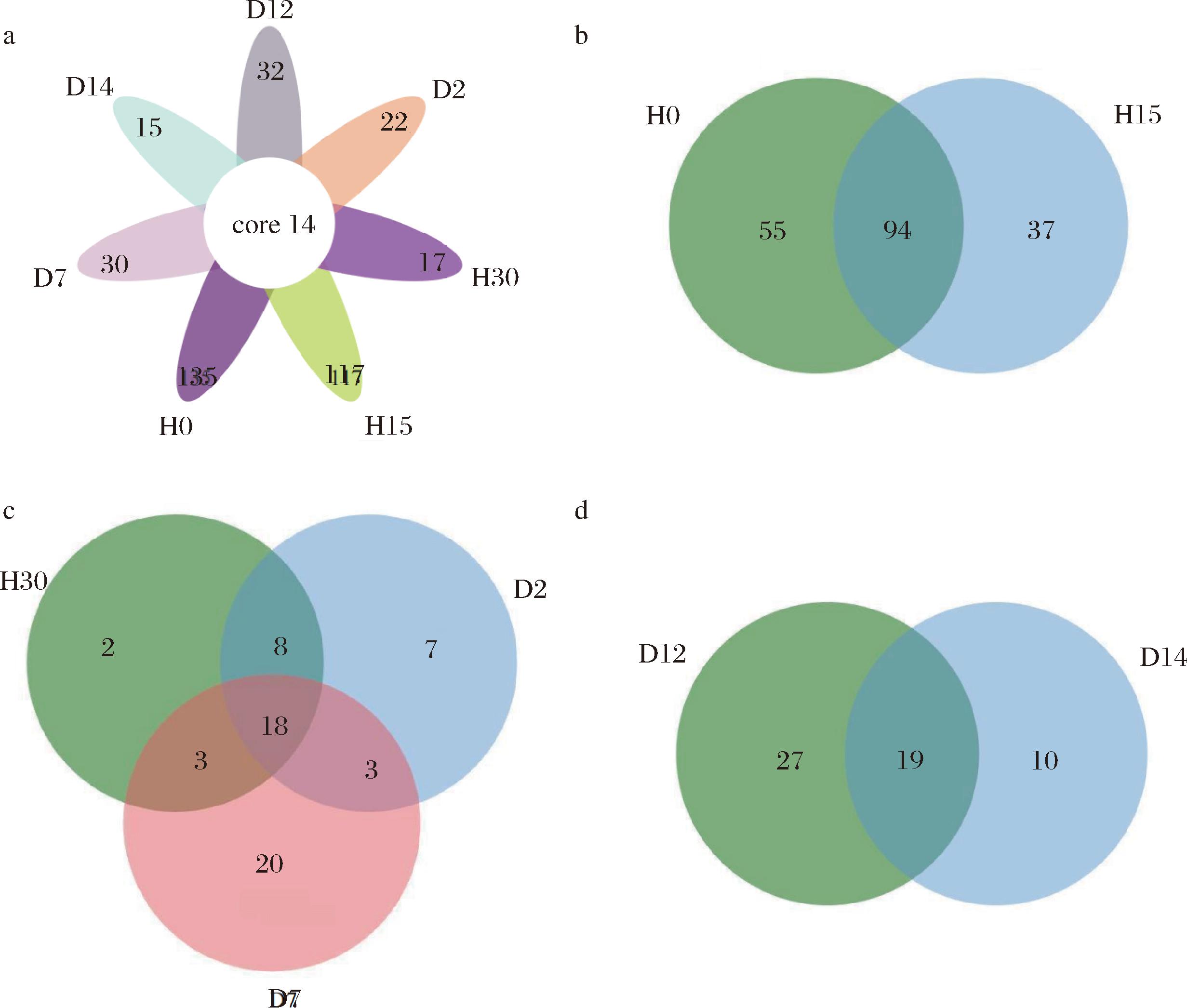 在属分类水平下,除没有准确注释信息序列的物种外,从7个岭南小曲白酒发酵醪样品中共检测到209个细菌属。采用花瓣图和韦恩图统计岭南小曲白酒生产各阶段样品中共有和独有的细菌属,结果如图2所示。岭南小曲白酒生产各阶段共有细菌属14个,分别占H0、H15、H30、D2、D7、D12、D14酒醪样品的9.40%、10.69%、45.16%、38.89%、31.82%、30.43%、48.28%(图2-a),这说明7个生产阶段酒醪样品中,细菌物种组成差异较大;除未分类菌属外,共有菌属为13个,分别为粘液乳杆菌属(Limosilactobacillus)、魏斯氏菌属(Weissella)、乳球菌属(Lactococcus)、乳杆菌属(Lactobacillus)、醋酸杆菌属(Acetobacter)、明串珠菌属(Leuconostoc)、片球菌属(Pediococcus)、乳酪杆菌属(Lacticaseibacillus)、植物乳植杆菌属(Lactiplantibacillus)、假交替单胞菌属(Pseudoalteromonas)、气单孢菌属(Aeromonas)、Loigolactobacillus和Liquorilactobacillus,综上可知,在白酒发酵过程中,酸度和乙醇浓度升高,氧气含量逐渐减少,大部分细菌因不能适应该环境而逐渐衰亡,乳酸菌最终成为绝对优势的细菌[18],且14个共有细菌菌属贯穿岭南小曲白酒的整个发酵过程,对岭南小曲白酒的发酵具有重要意义。如图2-b~图2-d所示,就特有细菌属而言,发酵前期酒醪H0的特有细菌属种类最多,为55个,随着发酵时间的延长,酒醪中特有菌属种类逐渐减少(图2-b);发酵中期酒醪样品特有细菌属种类呈递增的趋势,但相较于发酵前期,总体特有细菌属依旧呈递减趋势(图2-c);发酵后期特有细菌属种类呈递减趋势(图2-d)。发酵前期H0与H15共有细菌属为94,发酵中期H30、D2、D7共有细菌属为18;发酵后期D12与D14共有细菌属为19。以上结果表明随着发酵进程的推进,发酵体系中乙醇等代谢产物不断累积,导致岭南小曲酒醪中细菌遭受乙醇等环境胁迫,发酵体系中细菌群落丰富度逐渐降低。