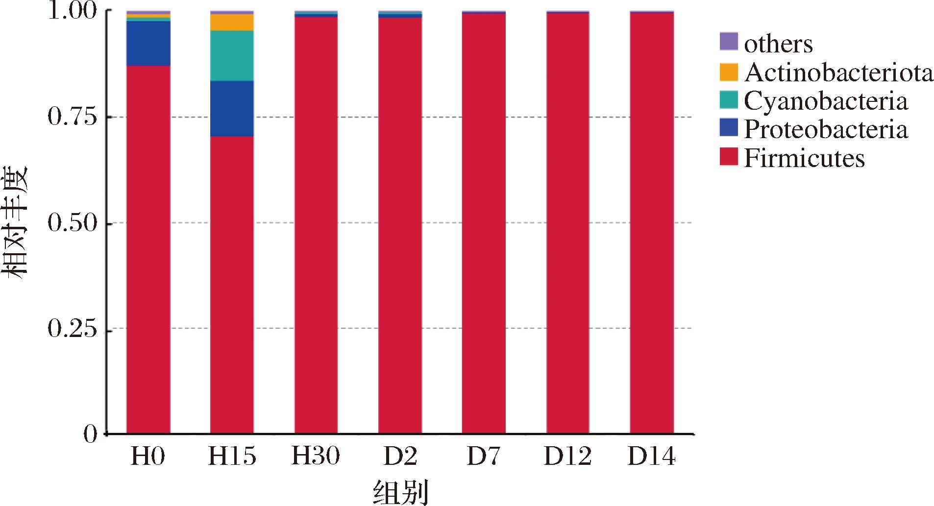 将相对丰度<1%合并为others,绘制成柱状图如图3所示,显示了岭南小曲白酒不同发酵时期,细菌在门水平上的相对丰度堆叠图。在门水平上,7个发酵阶段白酒样品中,细菌群落组成较为简单,在相对丰度≥1.0%的阈值下,共检出4个细菌门,分别为厚壁菌门(Firmicutes)、变形菌门(Proteobacteria)、蓝菌门(Cyanobacteria)、放线菌门(Actinobacteriota)。厚壁菌门贯穿于岭南小曲白酒发酵的各个时期,为绝对优势菌门[19-20],占比均在70%以上,表明厚壁菌门更能适应白酒发酵环境[21]。变形菌门在发酵前期的相对丰度小幅度增加,后随着发酵时间的延长,其相对丰度大幅降低,稳定在1%以下;蓝菌门、放线菌门在发酵开始时相对丰度均不及1%,而后在发酵15 h 时均有所提升,分别达11.92%、3%,随后两者相对丰度均下降至不足1%。综上可知岭南小曲白酒发酵过程中,变形菌门、蓝菌门和放线菌门相对丰度的变化趋势与厚壁菌门相反,推测变形菌门、蓝菌门、放线菌门主要在发酵前期发挥作用,这与高俊杰[22]的研究结果较为相似。