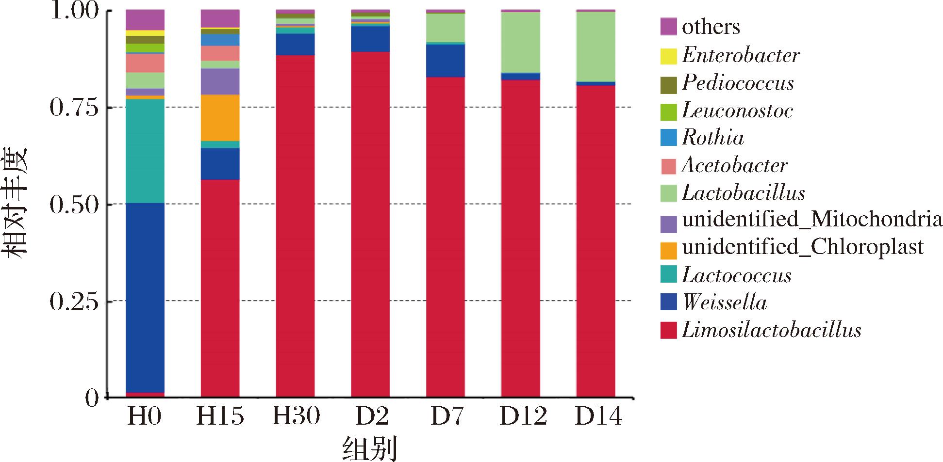 图4显示了岭南小曲白酒不同发酵时期,细菌在属水平上的相对丰度堆叠图。在属水平上,在相对丰度≥1%的阈值下,共得到9个已分类细菌属,分别为粘液乳杆菌属(Limosilactobacillus)、魏斯氏菌属(Weissella)、乳球菌属(Lactococcus)、乳杆菌属(Lactobacillus)、醋酸杆菌属(Acetobacter)、罗斯氏菌属(Rothia)、明串球菌属(Leuconostoc)、片球菌属(Pediococcus)、肠杆菌属(Enterobacter)。发酵初始细菌菌群与其他发酵节点菌群有较大差异。粘液乳杆菌属在2020年从乳杆菌属中分离出来并进行了重新分类[23],其在发酵初始相对丰度仅达1.39%,在发酵15 h时迅速攀升至56.38%,而后相对丰度一直稳定在80%以上,可知其是除0 h外发酵阶段的绝对优势菌属,这与LIU等[24]的研究较为相似,该研究发现高温大曲发酵早期,即非高温发酵时期,粘液乳杆菌属相对丰度大幅增加,其代谢活动有利于释放丰富的能量驱动碳水化合物和氨基酸等多种基础代谢,推测本研究中的粘液乳杆菌属同样发挥此作用[1];魏斯氏菌属发酵初始时相对丰度最高(48.91%),在H15时急剧下降至8.11%,此后该菌属呈连续下降趋势并伴有波动[25],同样,乳球菌属在发酵初期相对丰度也较高,可达26.91%,在发酵15 h时相对丰度也突然骤降,低至1.88%,这与ZHAO等[12]的研究结果较为相似,魏斯氏菌属、乳球菌属的相对丰度与粘液乳杆菌属呈反向变化,且有研究表明发酵初始存在于发酵体系中的魏斯氏菌属对白酒酿造过程有重要影响,其能够产生有机酸,从而抑制杂菌生长,其代谢产物促进发酵形成厌氧环境[26],随着发酵的进行,白酒的酸度、乙醇浓度增加,含氧量降低,魏斯氏菌属的生长受到抑制而逐渐衰亡,继而出现更耐酸、耐高浓度乙醇、耐低含氧量的乳酸菌完成后续发酵过程[27];值得注意的是,乳杆菌属在H0~D2相对丰度呈递减趋势(4.00%→0.64%),随着发酵的进行,在发酵第7天相对丰度达7.24%,此后在7.24%~17.99%的区间呈大幅递增趋势,推测可能是因为乳杆菌属兼性厌氧,有时微好氧,在有氧时生长差,随着发酵的进行,氧压降低,生长较好,经调研发现,乳杆菌属分类下的耐酸乳杆菌在白酒发酵中后期,同样保持相对较高的丰度,其对白酒发酵过程演替速率,风味物质代谢等方面均具有重要作用[28-29],故可推知,本文中的乳杆菌属同样会对岭南小曲白酒的发酵起到重要作用。