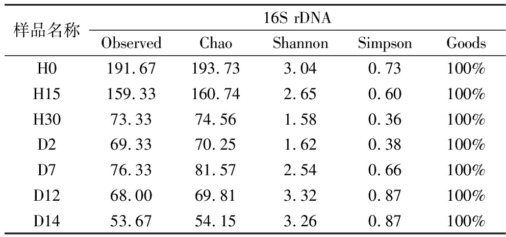 样品名称16S rDNAObservedChaoShannonSimpsonGoodsH0191.67193.733.040.73100%H15159.33160.742.650.60100%H3073.3374.561.580.36100%D269.3370.251.620.38100%D776.3381.572.540.66100%D1268.0069.813.320.87100%D1453.6754.153.260.87100%