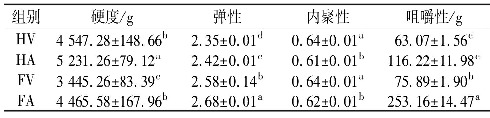 组别硬度/g弹性内聚性咀嚼性/gHV4 547.28±148.66b2.35±0.01d0.64±0.01a63.07±1.56cHA5 231.26±79.12a2.42±0.01c0.61±0.01b116.22±11.98cFV3 445.26±83.39c2.58±0.14b0.64±0.01a75.89±1.90bFA4 465.58±167.96b2.68±0.01a0.62±0.01b253.16±14.47a
