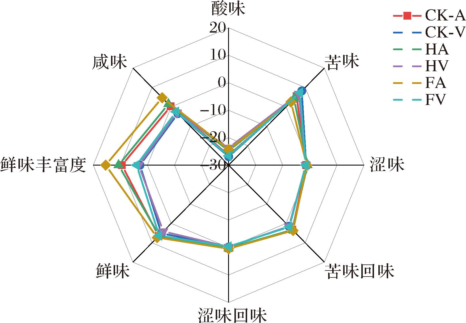参考李妍芃等[19]的方法并稍作修改,选择CK-A、CK-V、HV、HA、FV及FA样品进行研磨破碎后,称取5 g加入100 mL蒸馏水,于25 ℃振荡提取15 min,使用滤纸过滤后,滤液上机检测。电子舌检测参数设置如下:传感器预处理阶段依次使用负极清洗液(100 mmol/L盐酸+30%乙醇)清洗90 s,第一参比液(30 mmol/L氯化钾+0.3 mmol/L酒石酸)清洗120 s,第二参比液(10 mmol/L氢氧化钾+100 mmol/L氯化钾+30%乙醇)清洗120 s,随后在平衡位进行30 s基线校准。检测程序包括:样品分析30 s获取初始味觉响应值,3 s第一参比液快速清洗后,在新第一参比液中完成30 s余味检测。传感器系统:采用C00、AE1、CA0、CT0、AAE五通道味觉传感器系统,分别对应鲜味、酸味、苦味、咸味和涩味。每个样品进行4次重复测定,剔除首次循环数据后,取后续3次测定值的算术平均值作为最终检测结果。