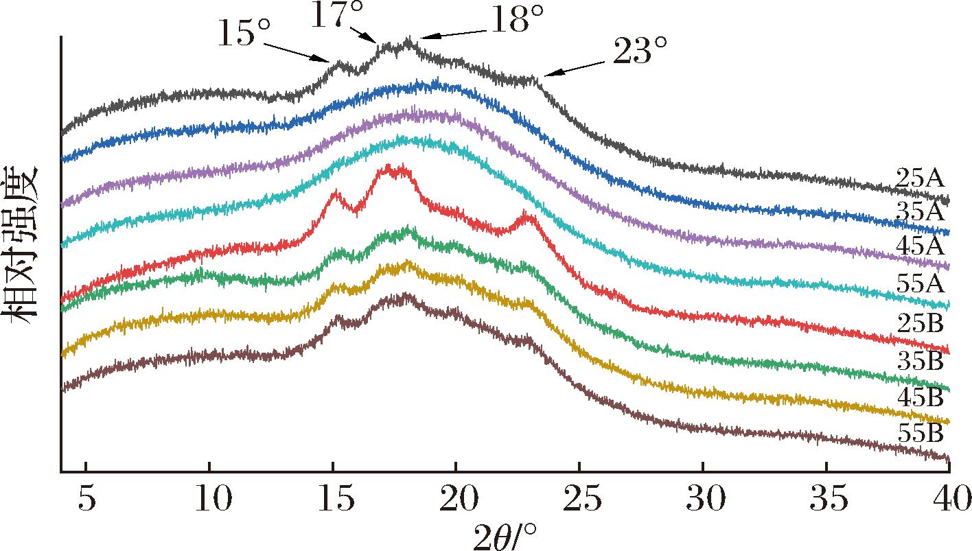 各样品经计算得到的相对结晶度如表3所示。相对结晶度从小到大按如下顺序:55A<45A<35A<55B<45B<35B<25A<25B。这表明低温和高湿有利于淀粉老化和重结晶。烘箱干燥的样品,25 ℃时的相对结晶度分别是35、45、55 ℃下样品的2.06、2.48、2.93倍,这一方面是因为较低温度有利于淀粉老化,另一方面是由于较低温度时干燥时间更长[15]。将相同干燥温度下控湿和不控湿样品的相对结晶度相比,25、35、45、55 ℃下的比值依次为:1.26、1.89、2.15、2.33。这意味着干燥温度越高时,高湿度环境对老化淀粉结晶度的贡献越明显。这是因为高湿度环境降低了糯米水分蒸发速率,延缓了糯米从橡胶态到玻璃态转变的过程,从而有利于淀粉分子链有序化聚集[13]。这与水分状态与水分分布分析结果一致。XIANG等[14]研究同样发现,甘薯粉条在恒定温度下控湿干燥,随着环境相对湿度增加,最终得到的干燥粉条的相对结晶度呈显著增加的趋势。