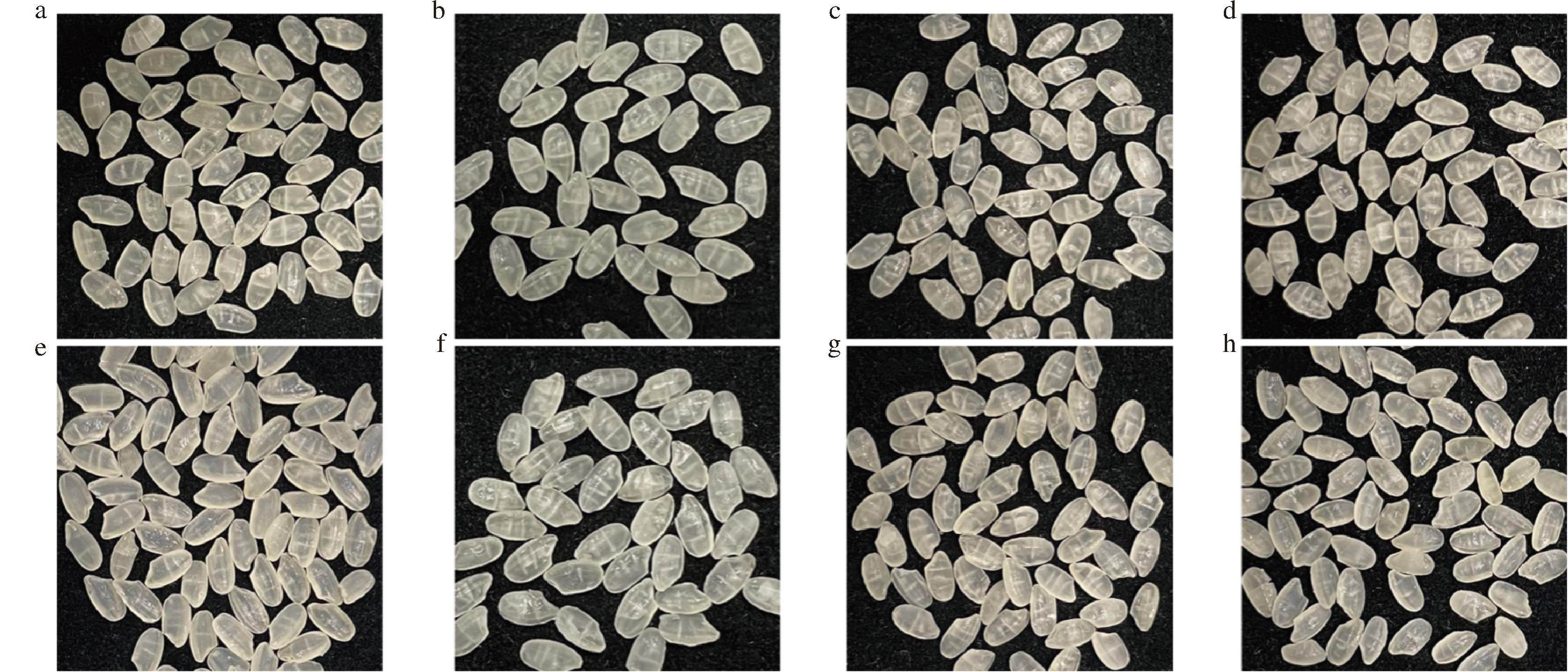 将糯米用去离子水淘洗2遍,随后用去离子水在4 ℃下浸泡过夜。接着在电磁炉用大火(2 200 W)蒸制10 min后取出,摊开冷却,将米粒搓散,分别放入电热恒温鼓风干燥箱(25、35、45、55 ℃)和恒温恒湿箱(温度-相对湿度组合:25 ℃-77%,35 ℃-77%,45 ℃-77%,55 ℃-77%)中干燥。干燥至样品水分含量约为13%后取出,密封保存。采用数码相机在简易的摄影棚中拍摄熟干糯米的数码照片。电热鼓风干燥箱内的样品按照干燥温度依次标记为25A、35A、45A、55A,恒温恒湿箱内的样品按照干燥温度依次标记为25B、35B、45B、55B。其中,25A为干燥处常温通风制得,视作阴干糯米样品。