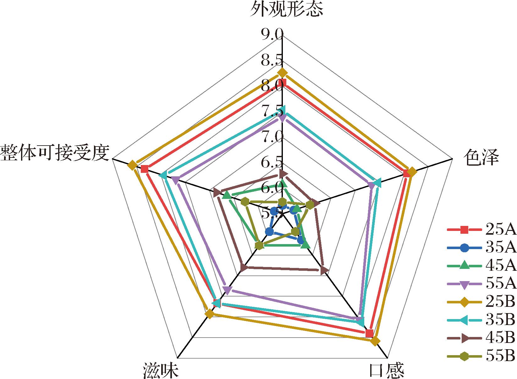 如图6所示,感官剖面最内圈是烘箱35 ℃干燥样品(35A)制作的米花,最外圈是77%温度25 ℃干燥样品(25B)制作的米花。前已述及,35A膨化率最小、硬度最大,其整体可接受度得分最低;25B膨化率和脆度最大,其整体可接受度得分最高。这表明蒸熟的糯米在相对湿度77%温度25 ℃时进行干燥,可获得最佳膨化效果,米花的感官品质最好。米花整体可接受度排序为:25B>25A>35B>55A>45B>45A>55B>35A。结果表明,干燥温度和相对湿度并非单独影响米花的整体可接受度,而是存在交互作用。此外,米花的整体可接受度排序与膨化率、比容的大小排序一致,这表明膨化越充分,米花的感官品质越好。