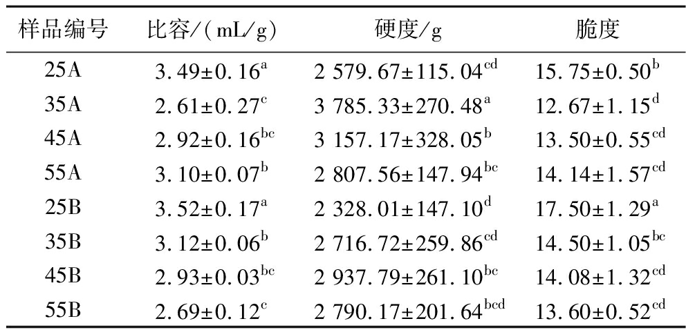 样品编号比容/(mL/g)硬度/g脆度25A3.49±0.16a2 579.67±115.04cd15.75±0.50b35A2.61±0.27c3 785.33±270.48a12.67±1.15d45A2.92±0.16bc3 157.17±328.05b13.50±0.55cd55A3.10±0.07b2 807.56±147.94bc14.14±1.57cd25B3.52±0.17a2 328.01±147.10d17.50±1.29a35B3.12±0.06b2 716.72±259.86cd14.50±1.05bc45B2.93±0.03bc2 937.79±261.10bc14.08±1.32cd55B2.69±0.12c2 790.17±201.64bcd13.60±0.52cd